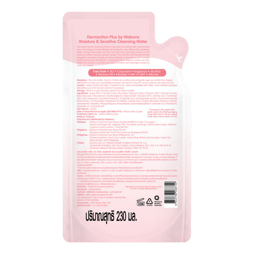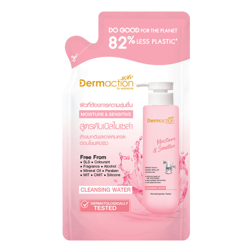 Dermaction Plus by Watsons เดอมาแอคชัน พลัส บาย วัตสัน มอยส์เจอร์ แอนด์ เซนซิทีฟ คลีนซิ่ง วอเตอร์ 230มล.(รีฟิล)