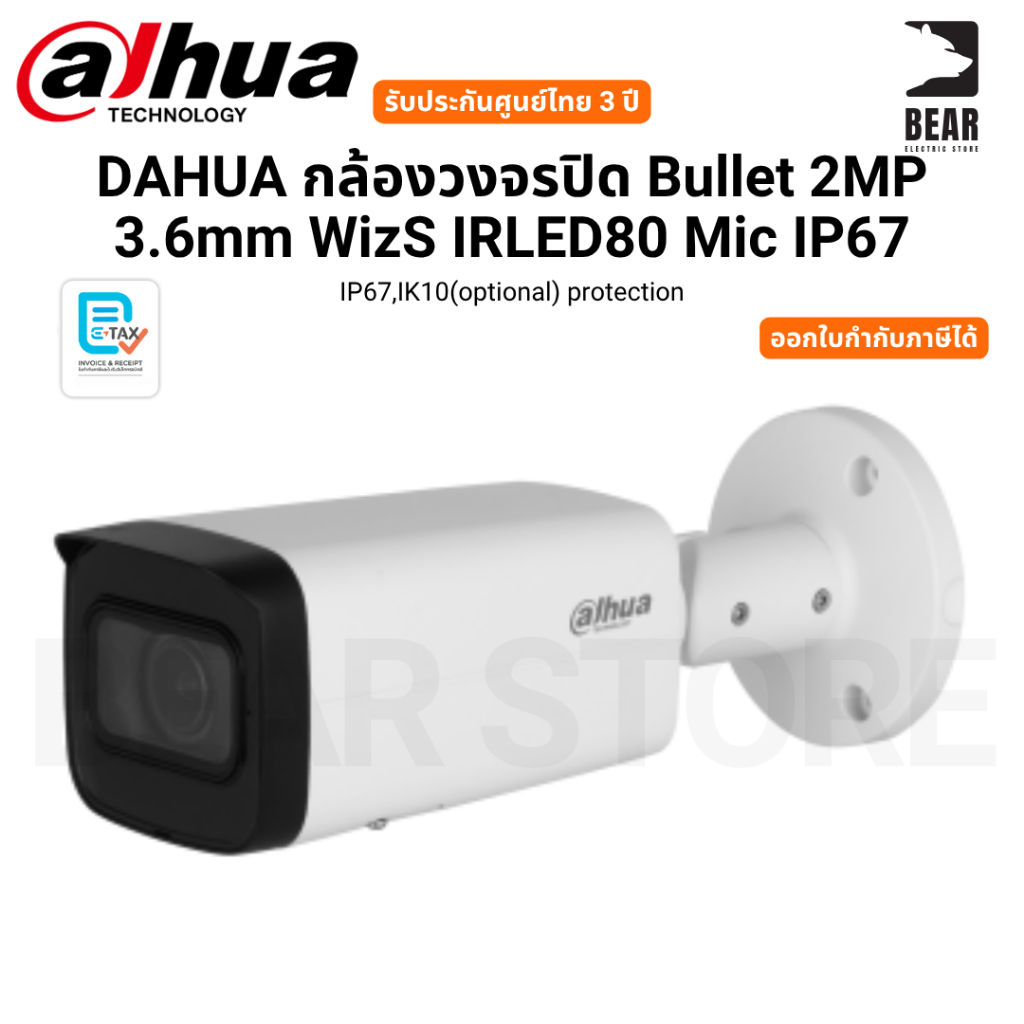 DAHUA กล้องวงจรปิด Bullet 2MP 3.6mm WizS IRLED80 Mic IP67 IP67,IK10(optional) protection รับประกันศูนย์ไทย 3 ปี