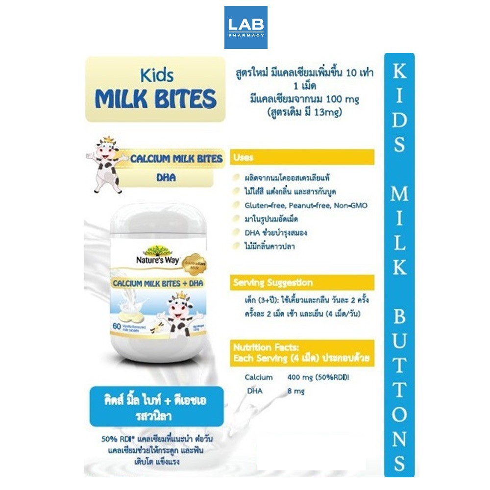 Nature's Way Calcium Milk Bites + DHA 60s - เนเจอร์ เวย์ นมอัดเม็ดเสริมแคลเซียม และ ดีเอชเอ 1 ขวด บรรจุ 60 เม็ด
