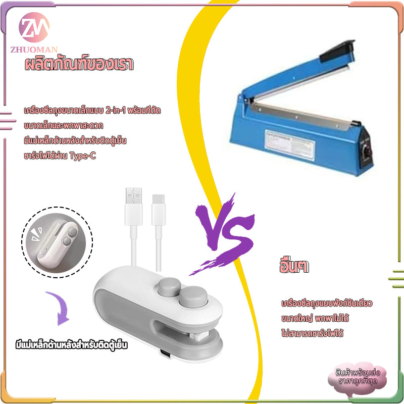 เครื่องซีลขนาดเล็ก เครื่องซีลถุงพลาสติก 2-in-1 เครื่องซีลถุงขนม ดีไซน์แม่เหล็กด้านหลัง ชาร์จ USB กันความชื้นและกันฝุ่น