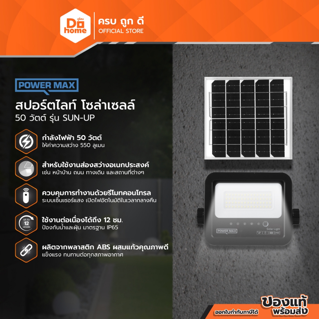 POWER MAX สปอร์ตไลท์โซล่าเซลล์ 50 วัตต์ รุ่น SUN-UP (Day Light) |ZWF|