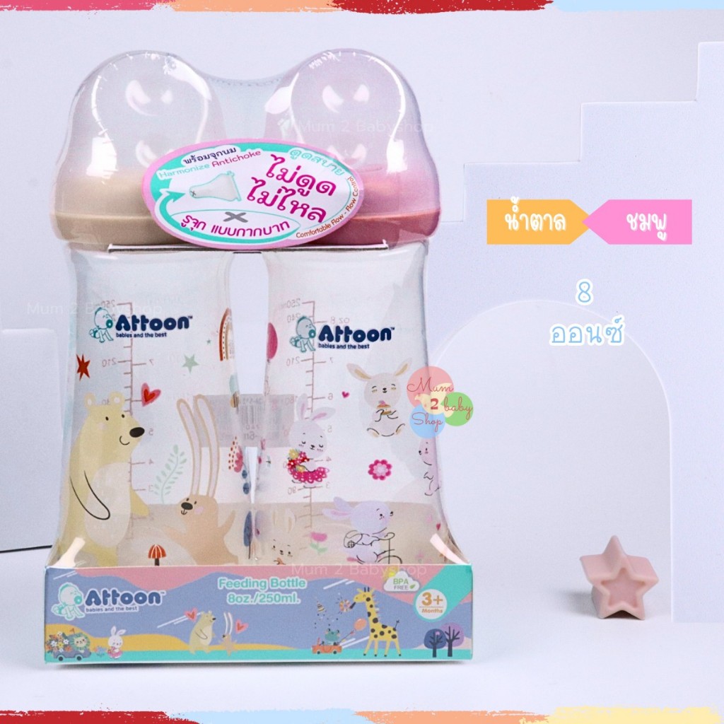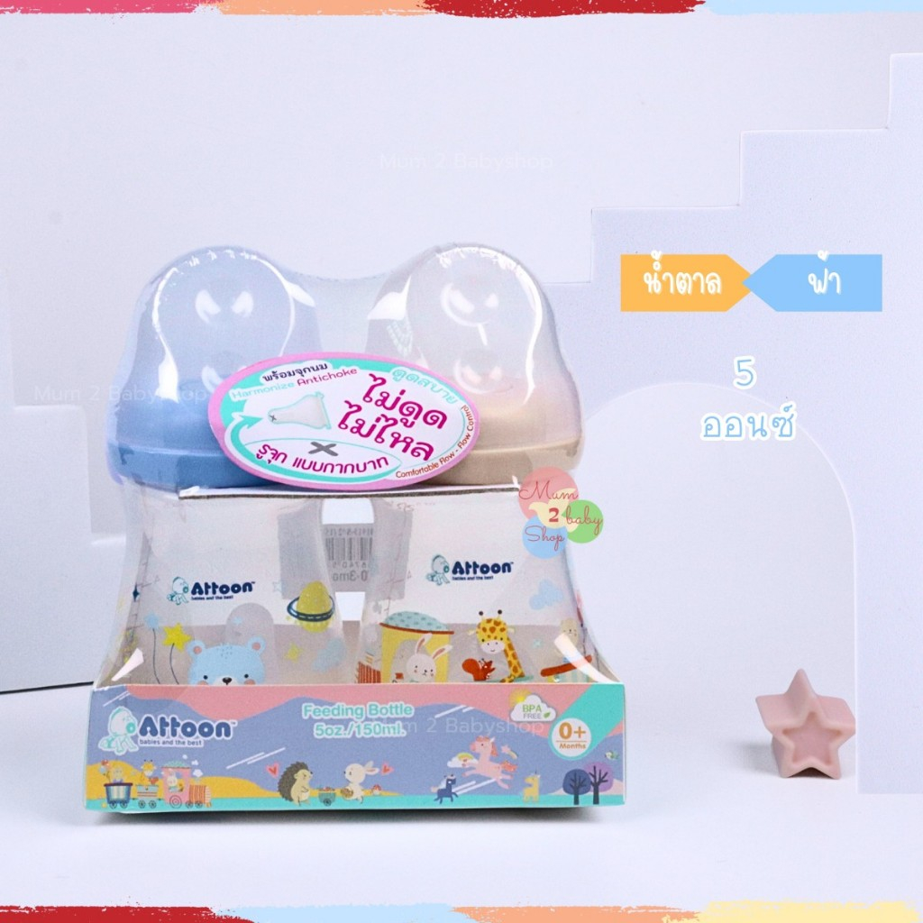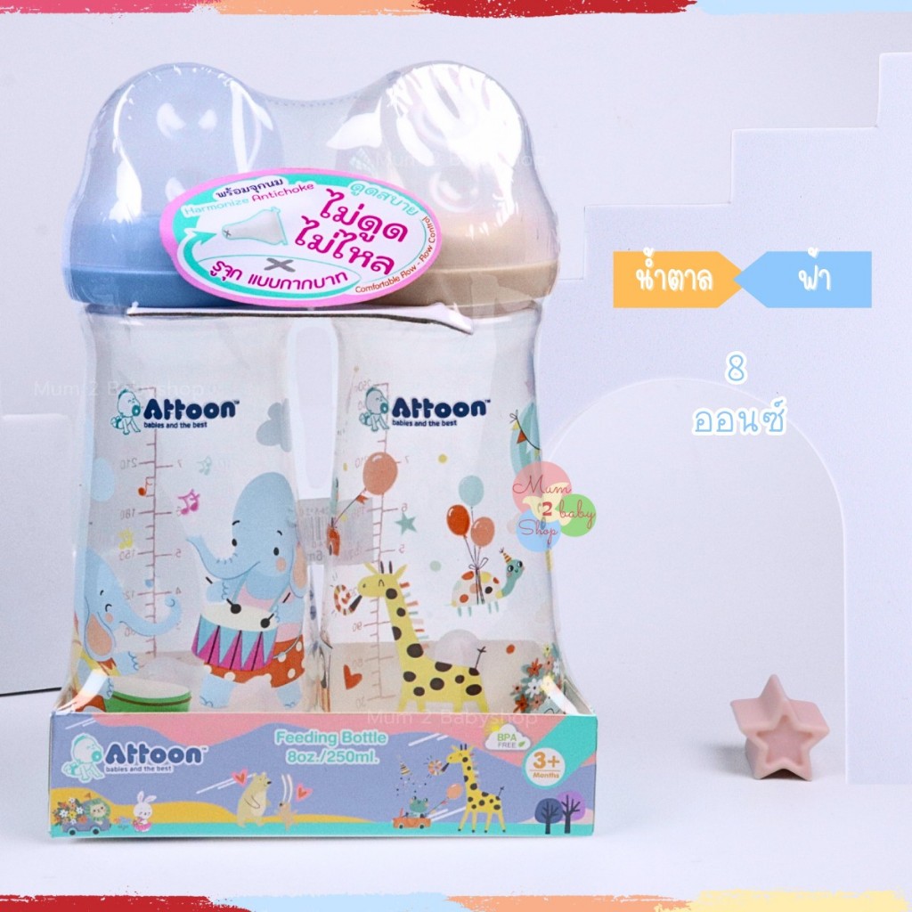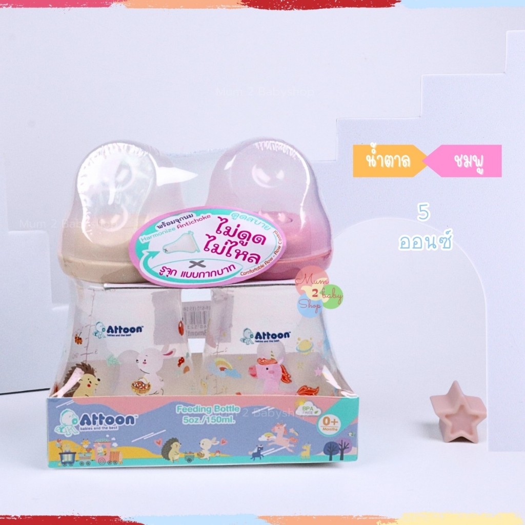 Attoon ขวดนมคอแคบ พร้อมจุก Antichoke ไม่ดูดไม่ไหล ขนาด 5ออนซ์ และ 8ออนซ์ แพคคู่
