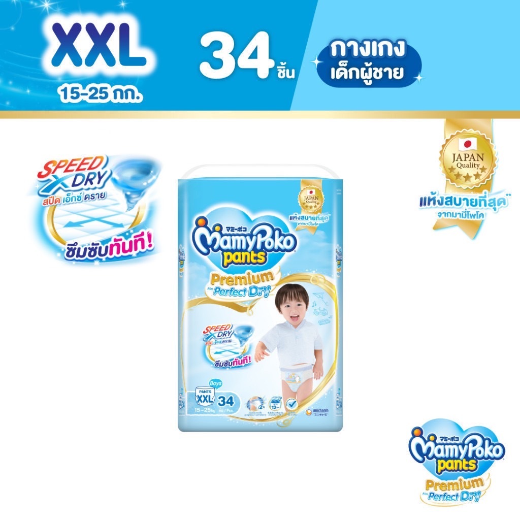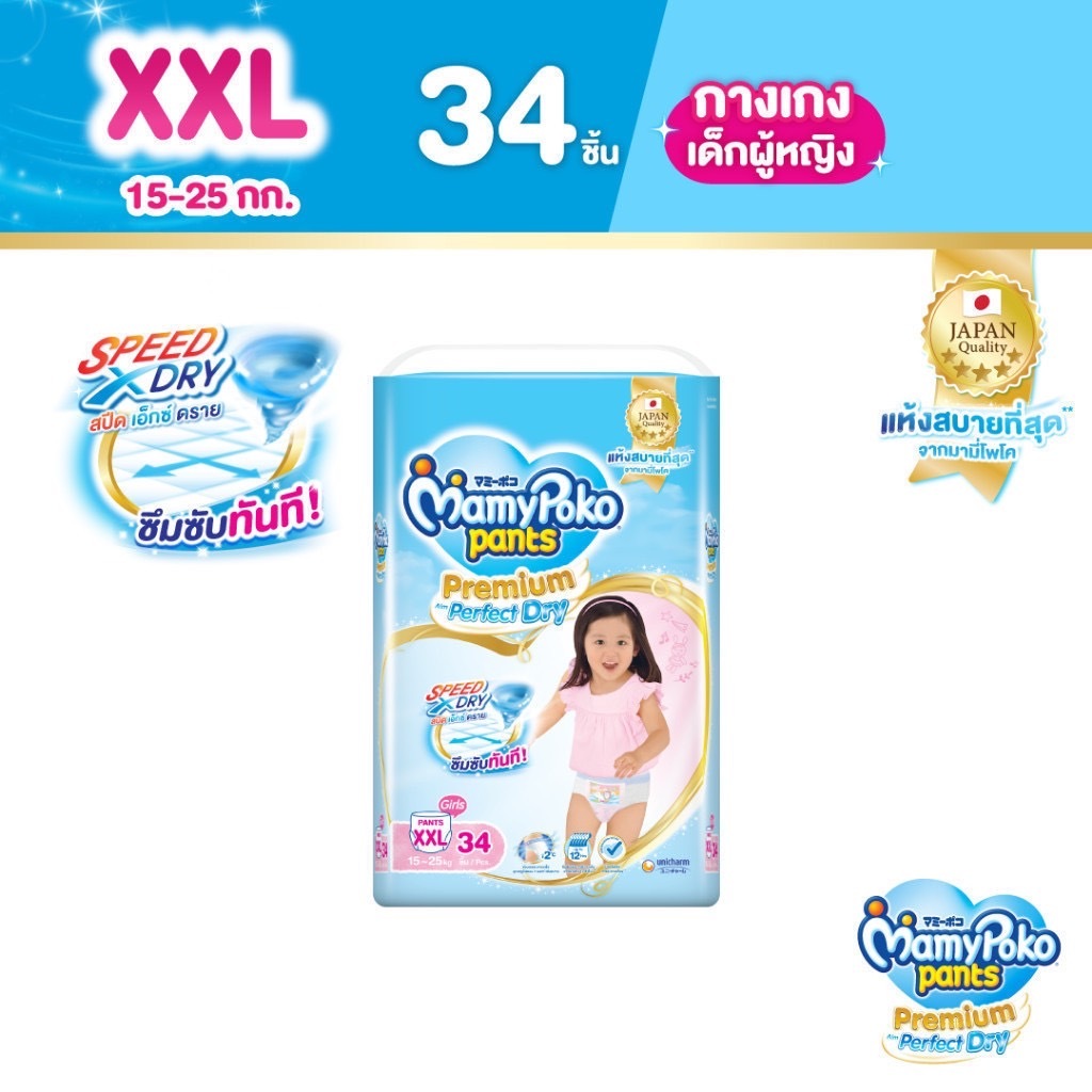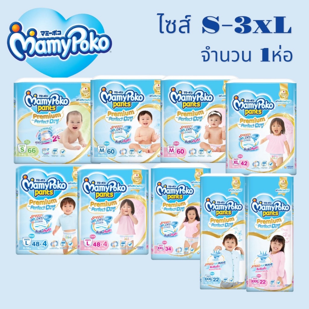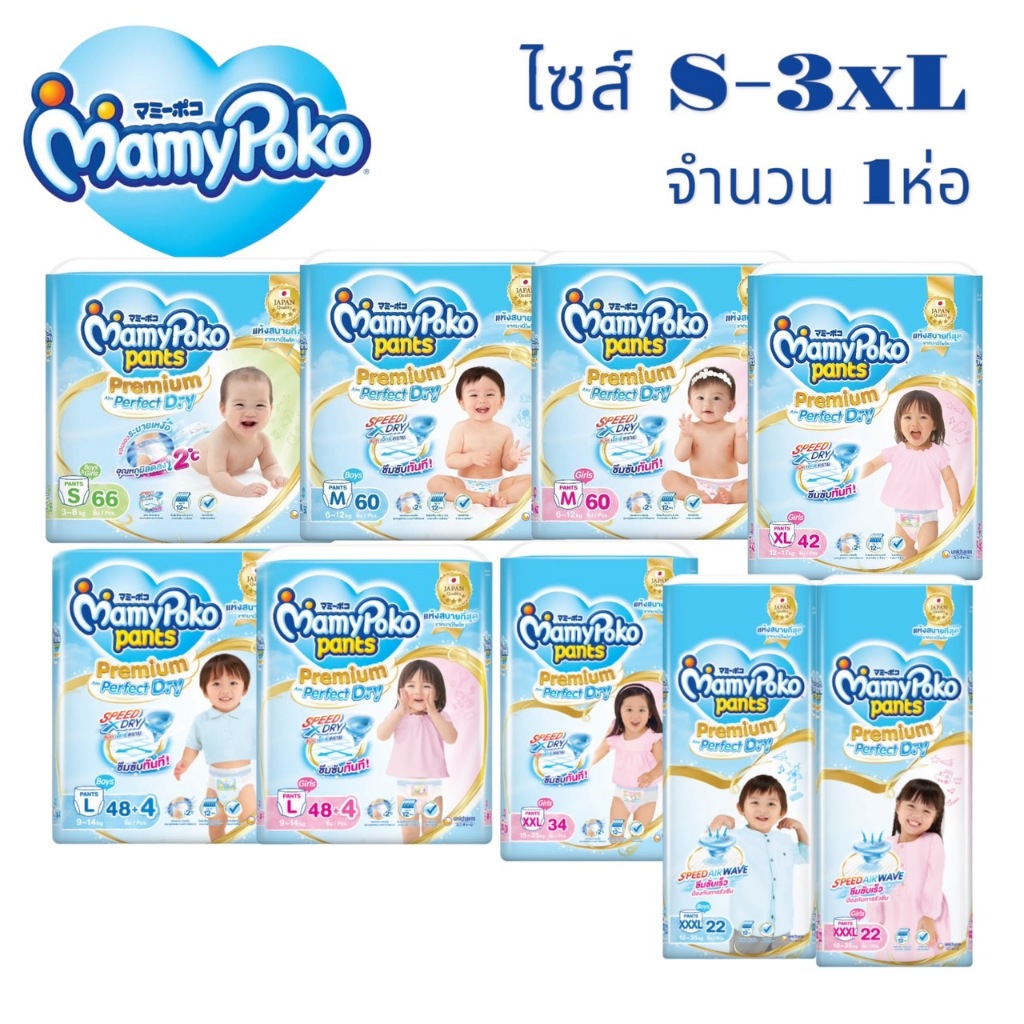MamyPoko มามี่โพโค แพ้นท์ พรีเมี่ยม เอม เพอร์เฟกต์ ดราย ห่อ สีฟ้า จัมโบ้ ไซส์ S-XXXL แพ็คเดี่ยว