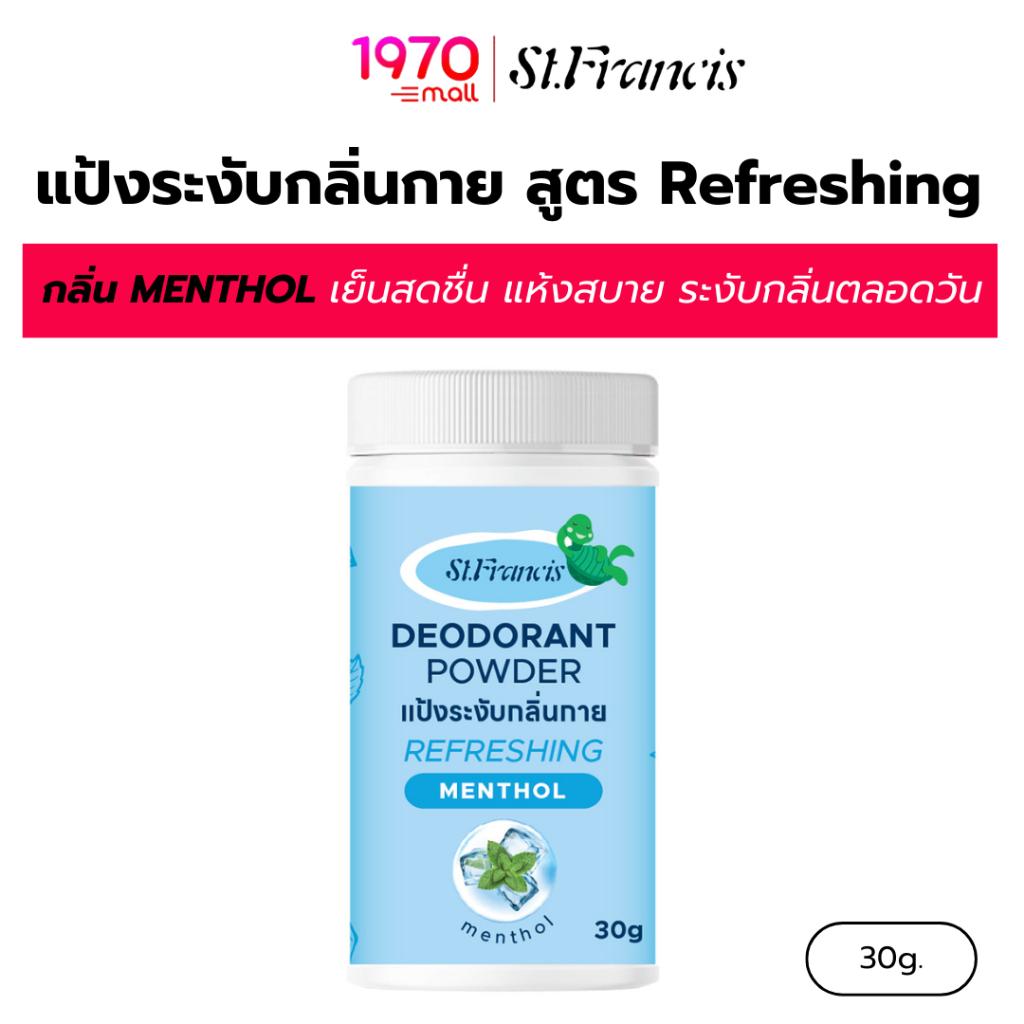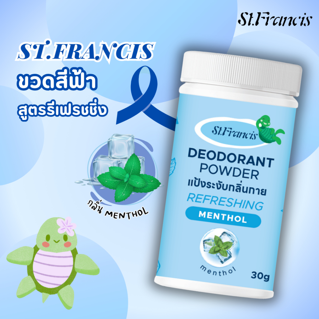 ST.FRANCIS แป้งระงับกลิ่นกาย สูตร Refreshing กลิ่น MENTHOL 30g. เนื้อแป้งบางเบา แห้งสบายเย็นสดชื่นมั่นใจ