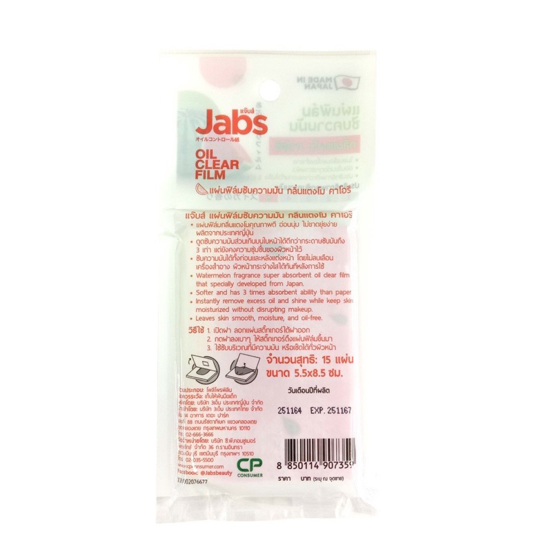 Jabs แจ๊บส์ แผ่นฟิมล์ ซับหน้ามัน กลิ่นแตงโม 15แผ่น