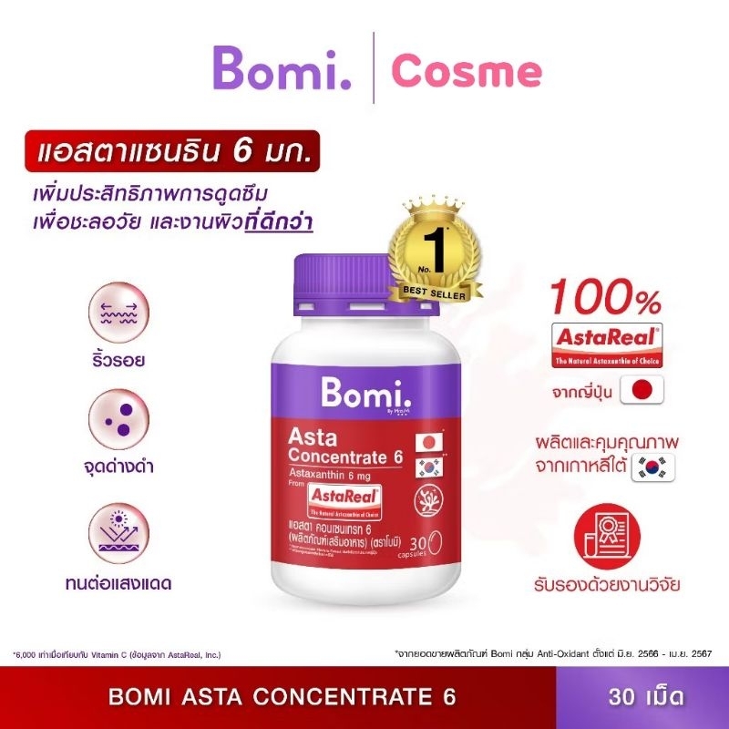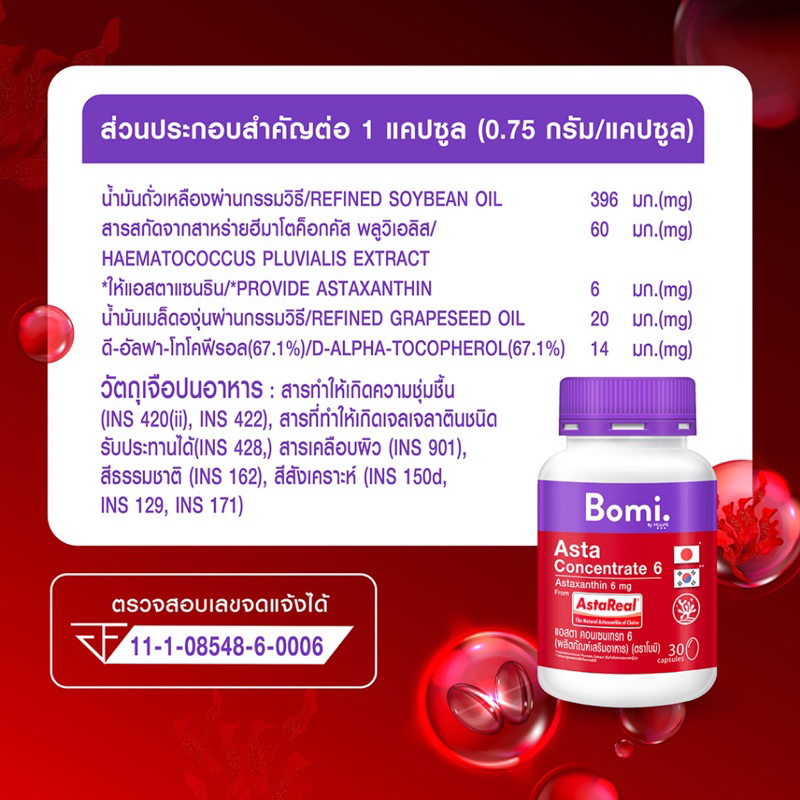 Bomi AstaReal Asta Concentrate 6 (30 Capsules) แอสตาแซนธิน ผิวกระชับ เนียนนุ่ม ชุ่มชื้น ลดความหมองคล้ำ