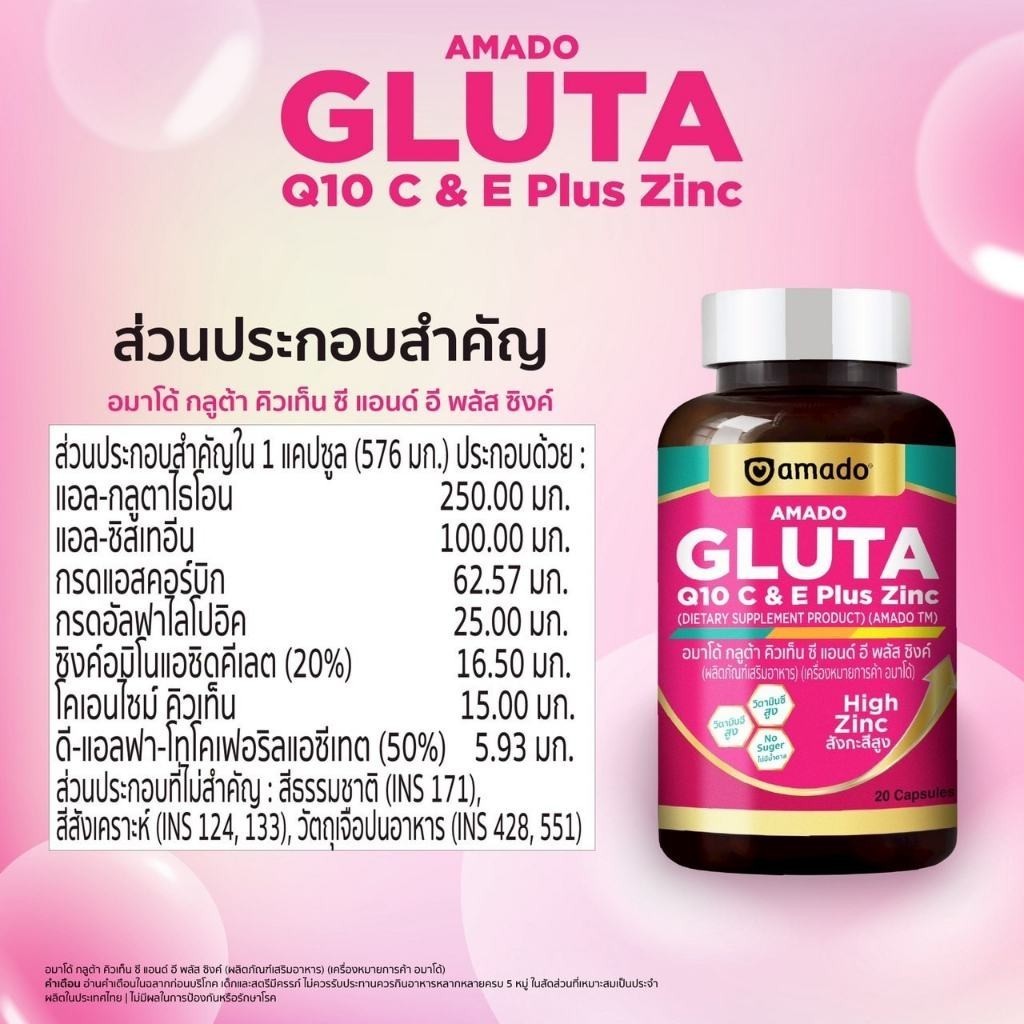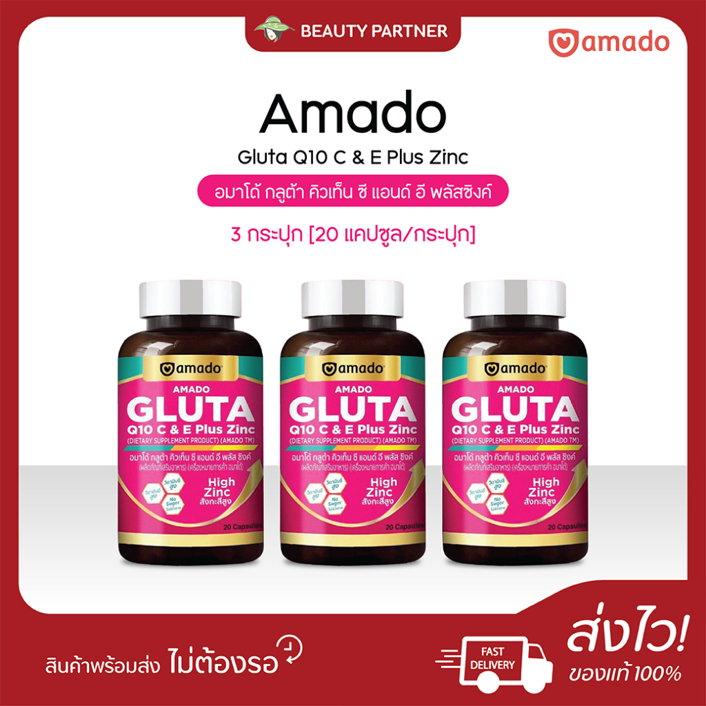 Amado Gluta Q10 C & E Plus Zinc อมาโด้ กลูต้า คิวเท็น ซี แอนด์ อี พลัสซิงค์ [20 แคปซูล] [3 กระปุก] กลูต้าแบบเม็ด ทานง่าย