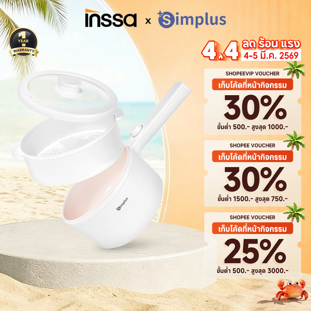 INSSA หม้อไฟฟ้า กระทะไฟฟ้า อเนกประสงค์ ไม่ติดหม้อ 600W เหมาะสำหรับ 2-3 คน 1.5L DZGH002WH02