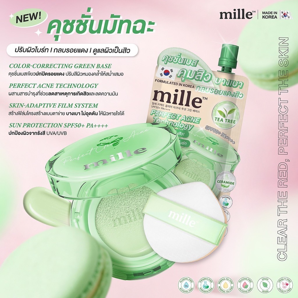 มิลเล่ คุชชั่นเบสเขียว คุชชั่นมัทฉะ Mille Perfect Clear Acne Cushion Green Base SPF 50+ PA+++