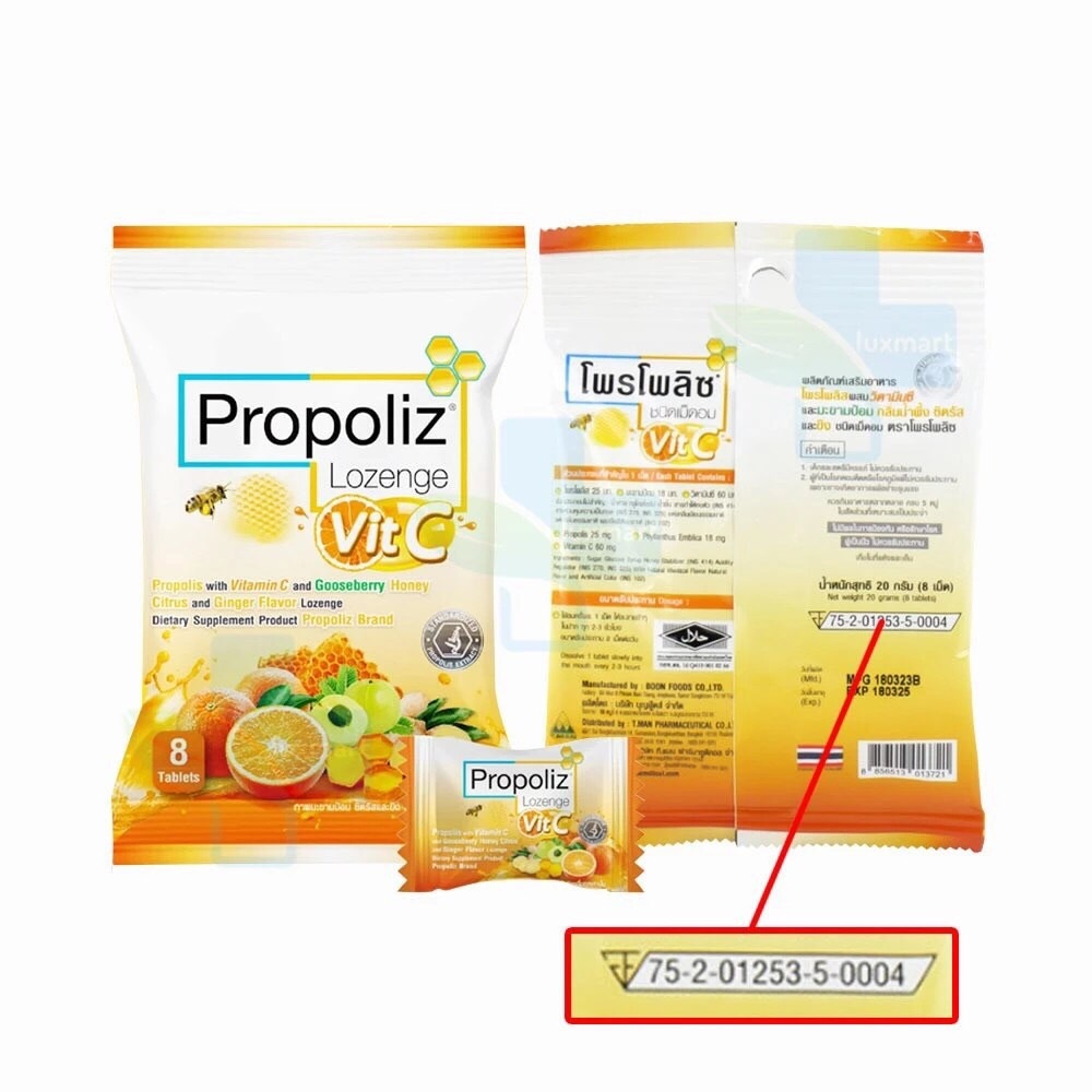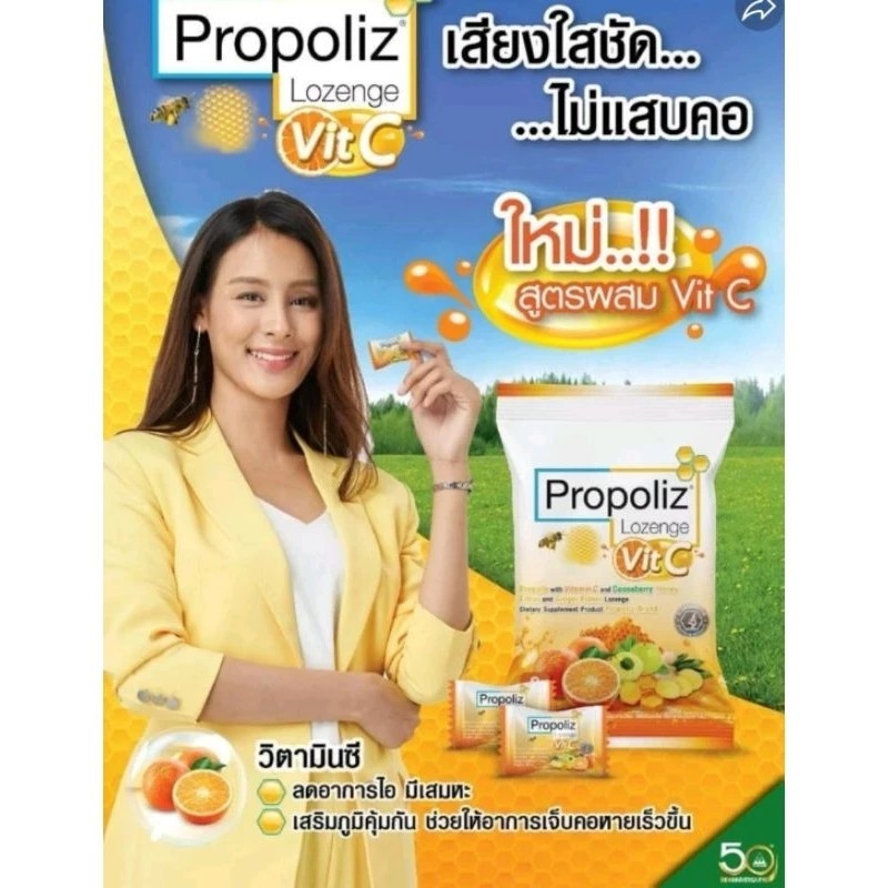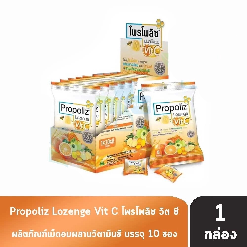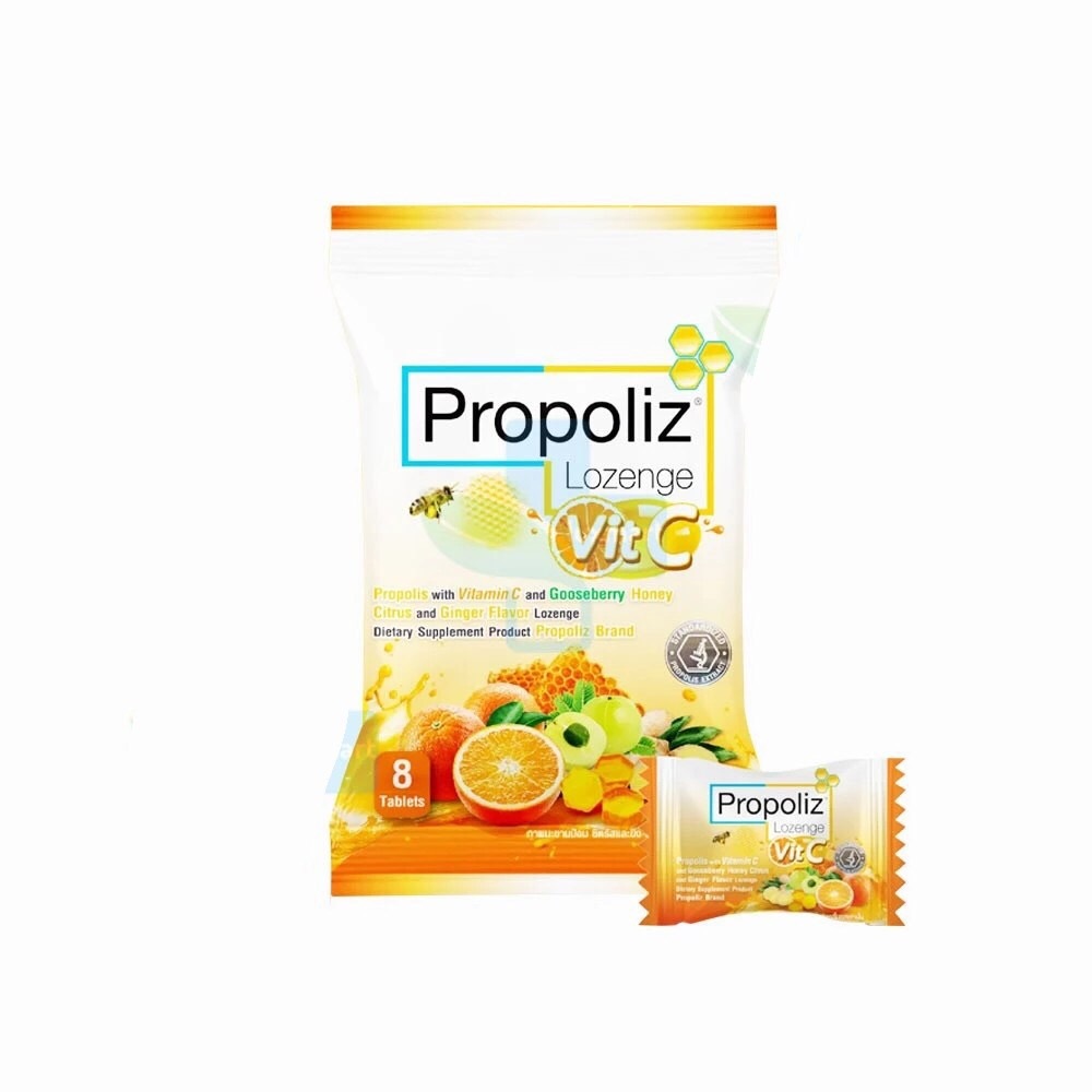 [ ยกกล่อง 10 ซอง ] Vit C Propoliz Lozenge โพรโพลิซ ชนิดเม็ดอม วิตซี ลูกอมชุ่มคอ 1 ซอง บรรจุ 8 เม็ด