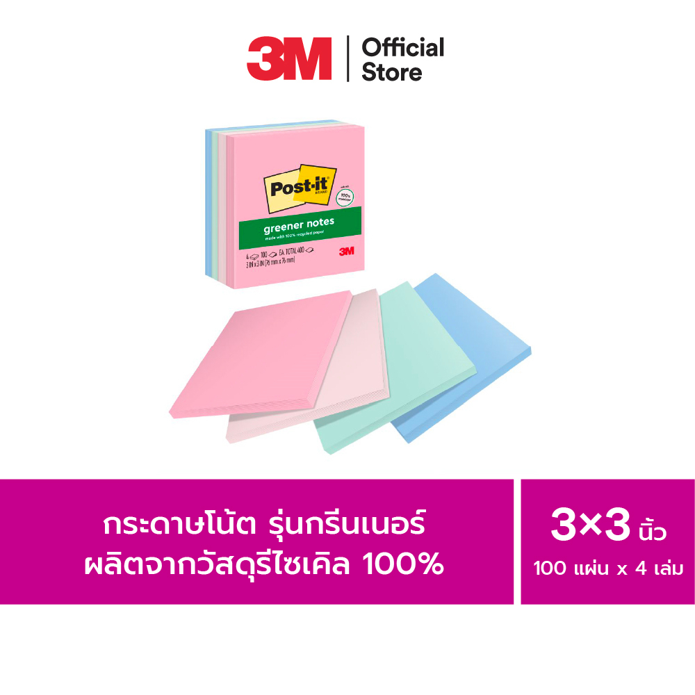 3M™ Post-it® โพสต์-อิท กรีนเนอร์โน้ต, 654-4RP-AP, 100 แผ่น/เล่ม, 3"x3", 4 เล่ม