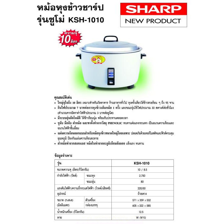 หม้อหุงข้าว Sharp รุ่น KSH-D1010 ขนาดความจุ 10 ลิตร (รับประกันสินค้า 3 ปี)