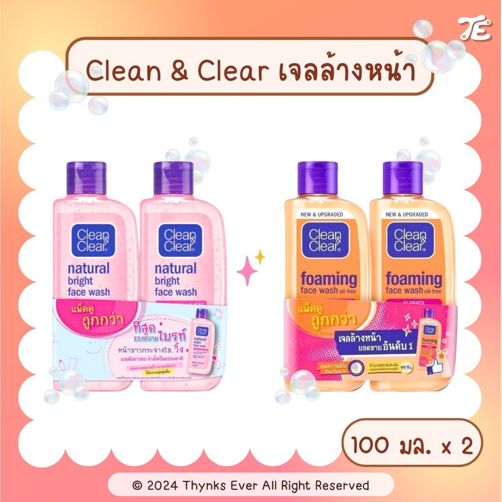 [แพ็คคู่] CLEAN & CLEAR คลีนแอนด์เคลียร์ เจลล้างหน้า 100 ml สูตร Essentials เป็นสิว ผิวมัน / Natural Bright หมองคล้ำ