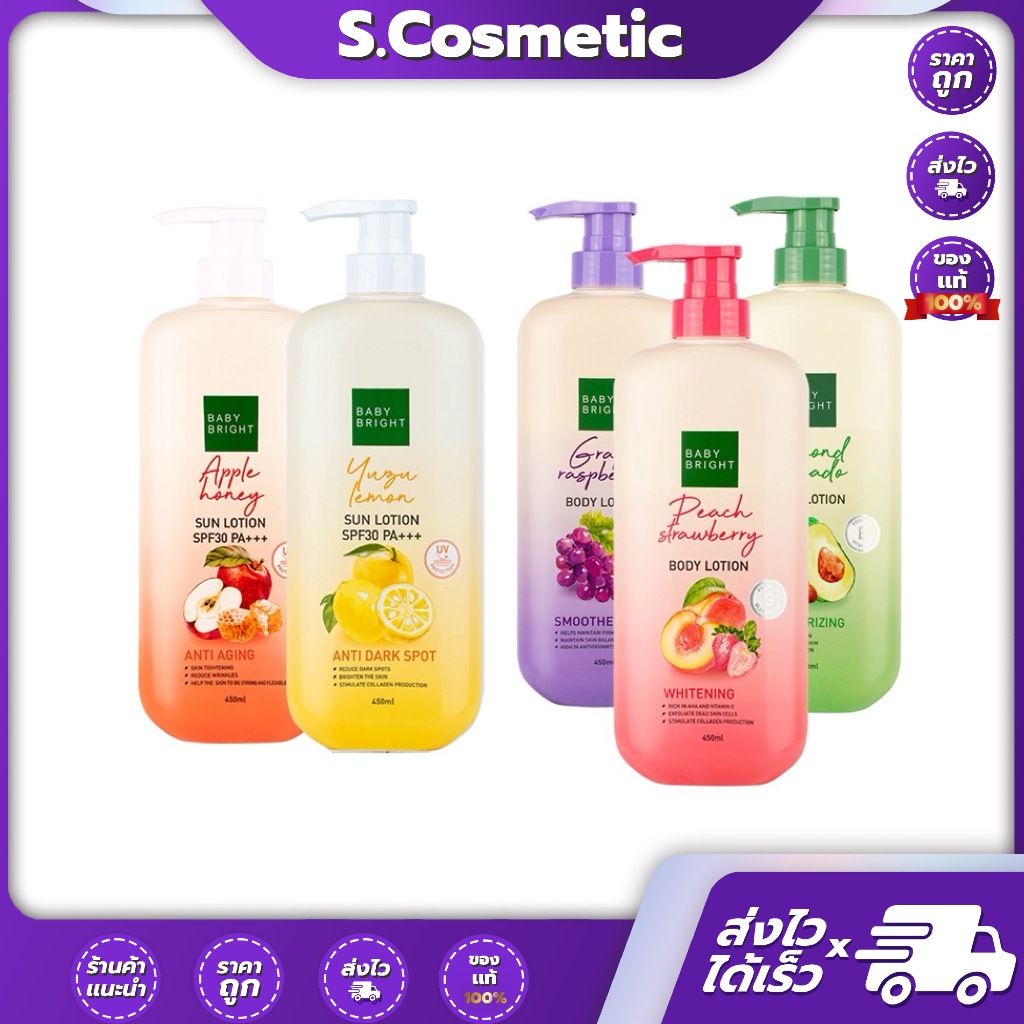 Baby Bright เบบี้ไบร์ท บอดี้ โลชั่น 450 มล. แอปเปิ้ลฮันนี่ซัน / ยูซุเลม่อนซัน / เกรฟราสเบอร์รี่ /อัลมอนด์อะโวคาโด /พีชสต