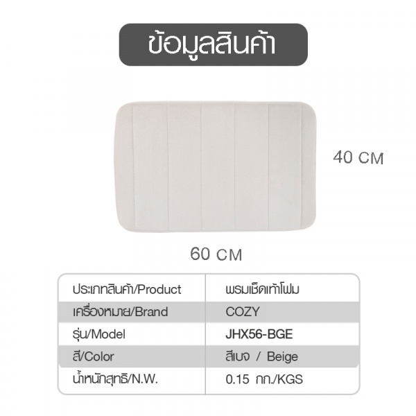 GlobalHouse พรมเช็ดเท้าโฟม Cozy ขนาด 40×60×1.2ซม. สีเบจ สินค้าของแท้คุณภาพดี