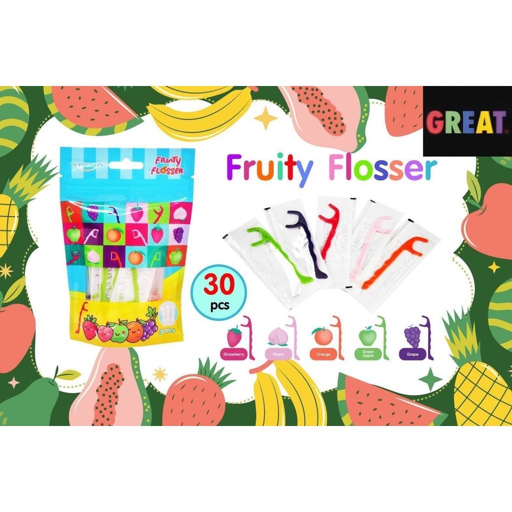 ไหมขัดฟัน กลิ่นผลไม้ ที่มาพร้อมกับกลิ่นผลไม้ 5 กลิ่น องุ่น สตรอเบอรี่ ส้ม พีซ และ แอปเปิ้ลเขียว 1 ถุง 30 ชิ้น