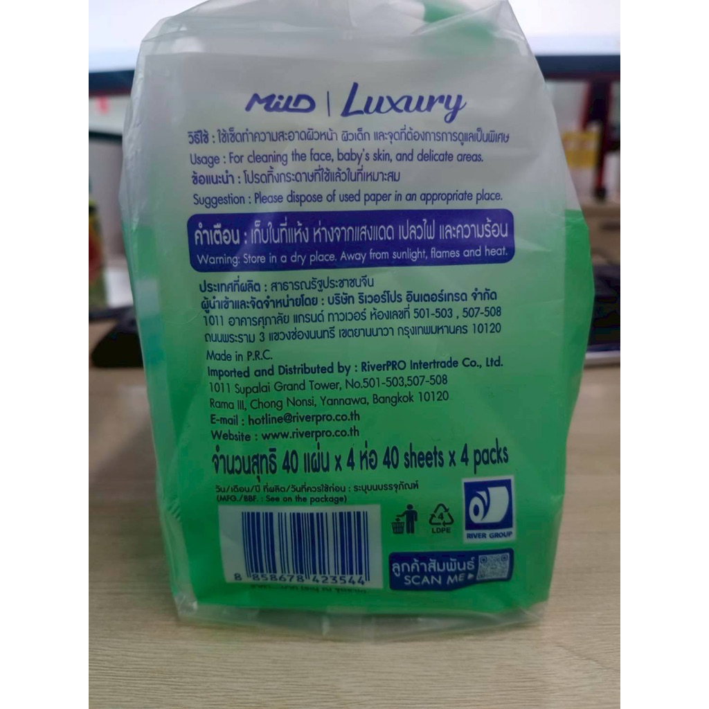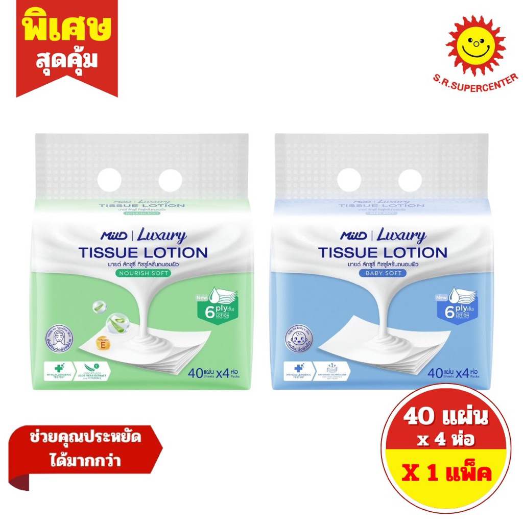 [ 1 แพ็ค ] Mild Luxury มายด์ ลักชูรี่ นูริชซอฟท์/เบบี้ซอฟท์ ทิชชูโลชั่น หนา 6 ชั้น ขนาด 40 แผ่น x 4 ห่อ 2 สูตร