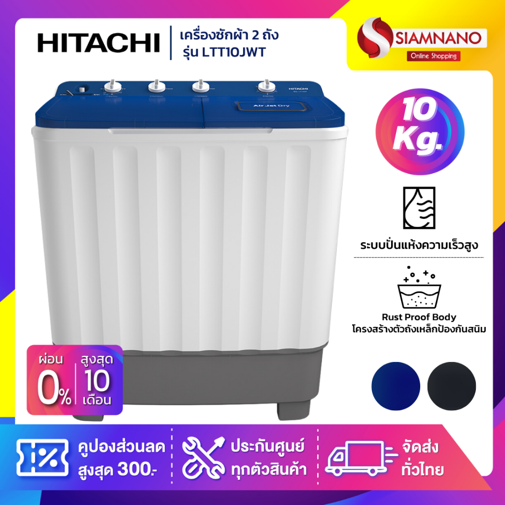 เครื่องซักผ้า 2 ถัง HITACHI รุ่น LTT10JWT / LTT 10JWT ขนาด 10KG. มี 2 สี (รับประกันนาน 10 ปี)