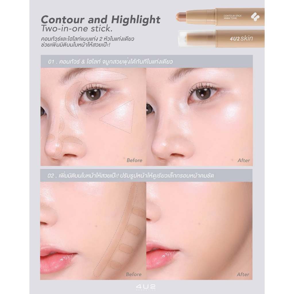 ถูก/แท้/มีไลฟ์ (2 ชิ้น 399.-) คอเรคเตอร์ คอนทัวร์ ไฮไลท์ 4U2 Skin Duo Color Corrector 4U2 Skin Contour Stick ปกปิดรอย