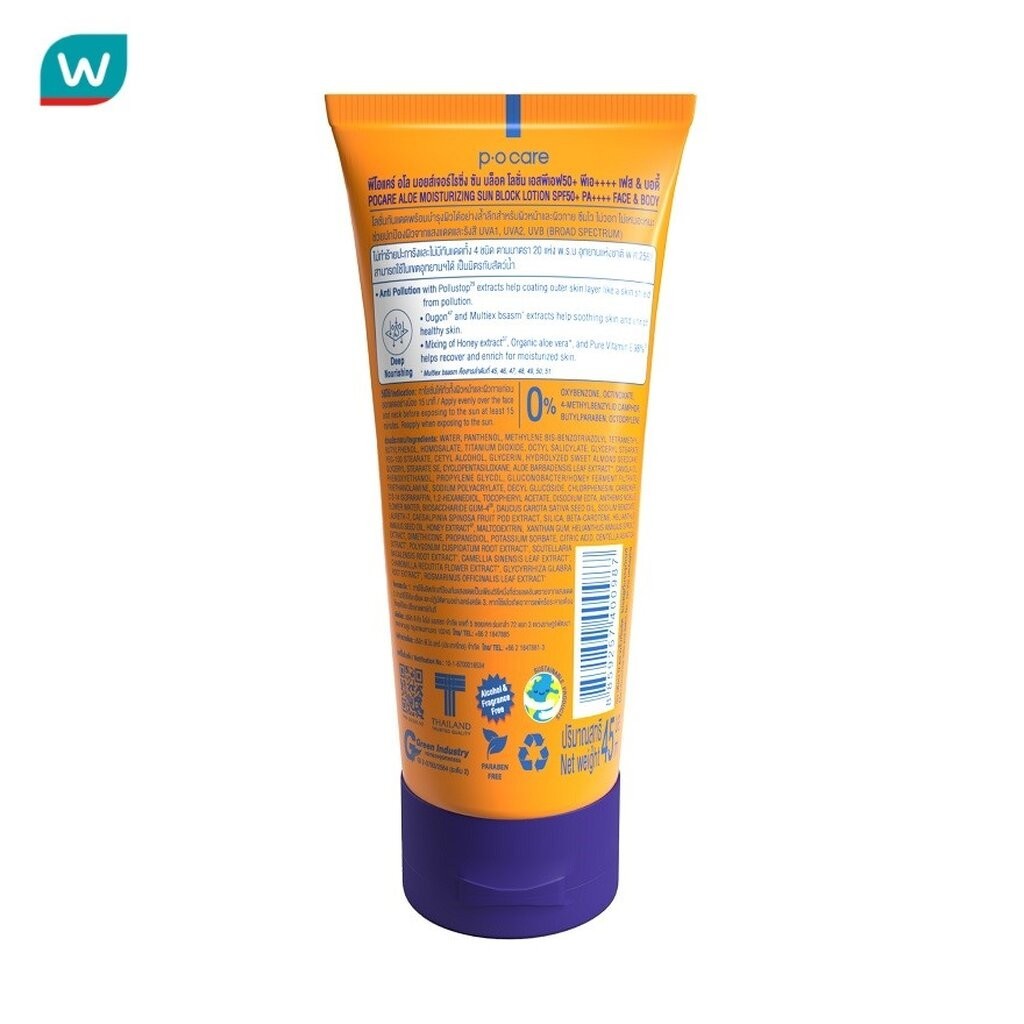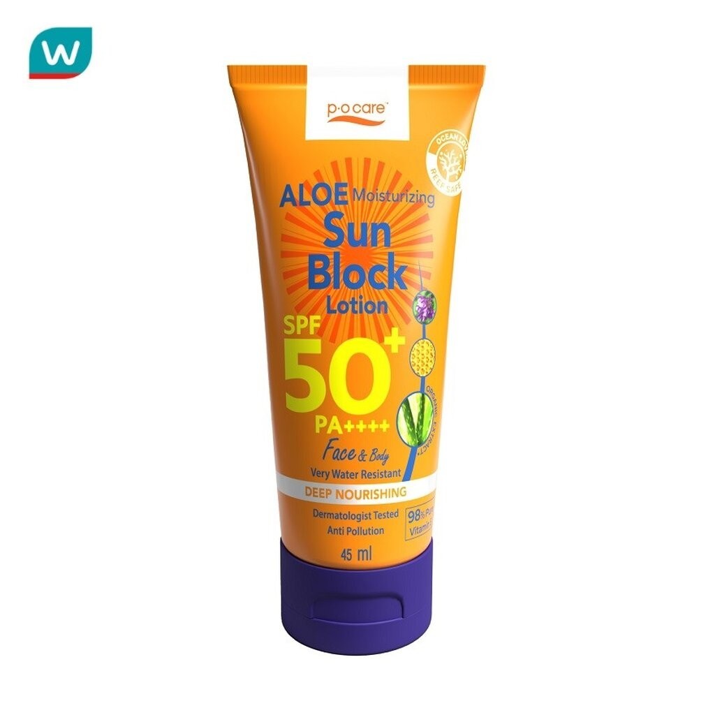 PO Care พีโอ แคร์อโล มอยส์เจอร์ไรซิ่ง ซัน บล็อค โลชั่น SPF50+ PA++++ เฟส แอนด์ บอดี้ 45 มล.