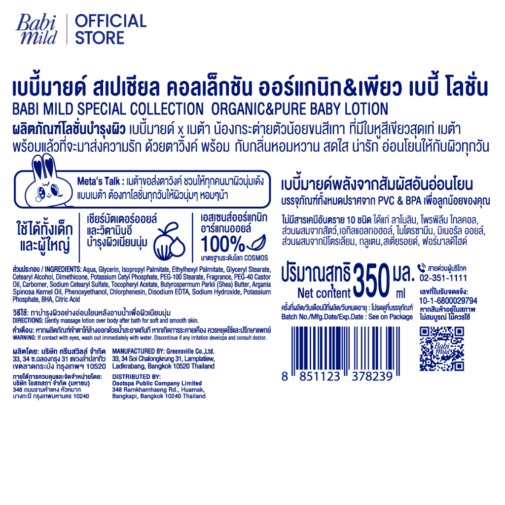 [1แถม1][Babi Mild x MeTaa] โลชั่นเบบี้มายด์ ออร์แกนิก&เพียว x เมต้า / Babi Mild Lotion 350ml