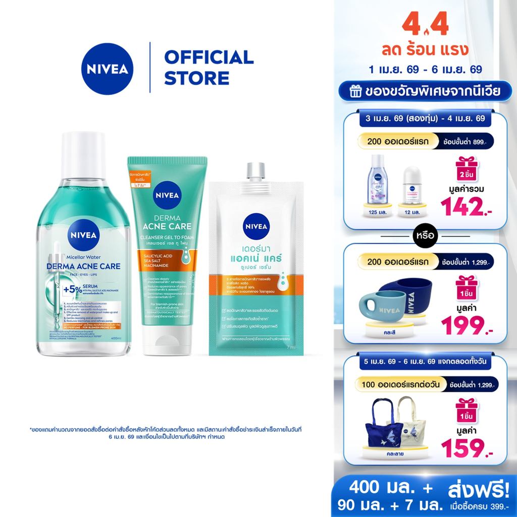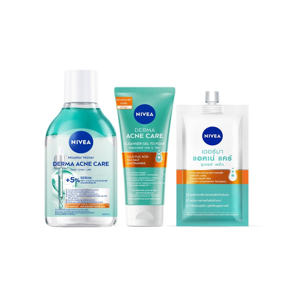 นีเวีย ไมเซล่า วอเตอร์ เดอร์มา แอคเน่ แคร์ 400 มล., เคลนเซอร์ 90 มล,แอคเน่ แคร์ ซูเปอร์ เซรั่ม7 มล.