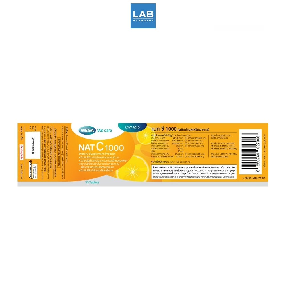 *[ซื้อ 1 แถม 1] MEGA We Care Nat C 1000mg 15 Tablets เมก้า แนท ซี 1000 (ผลิตภัณฑ์เสริมอาหาร) 15 เม็ด
