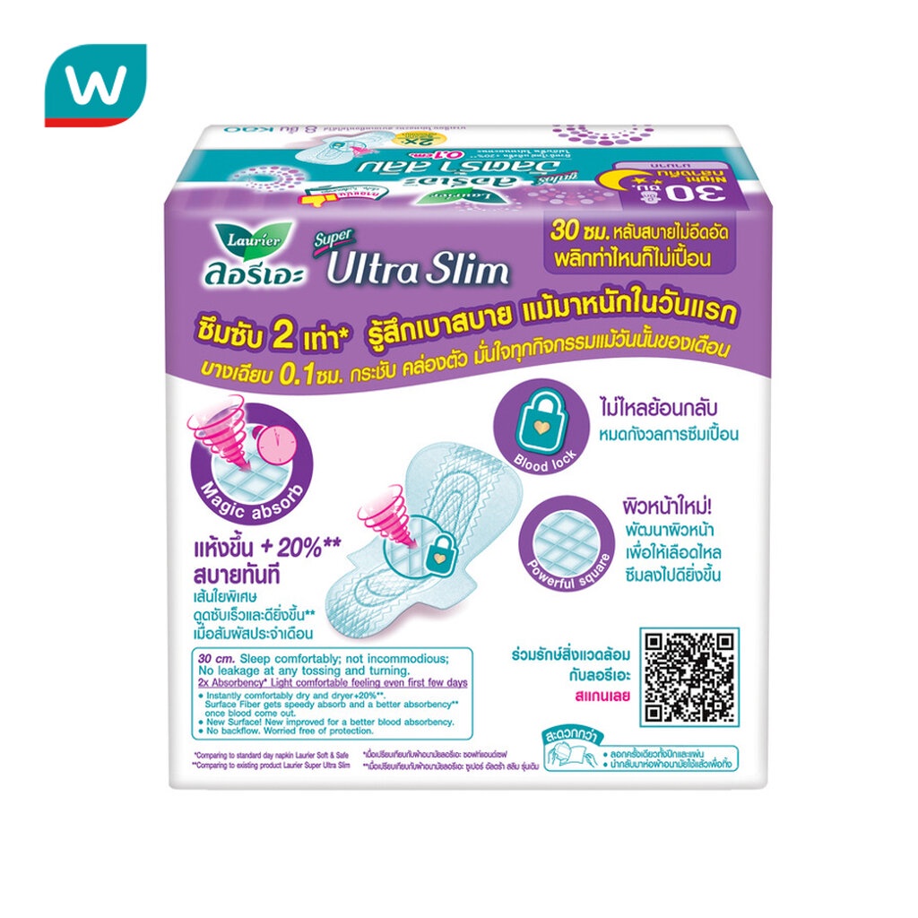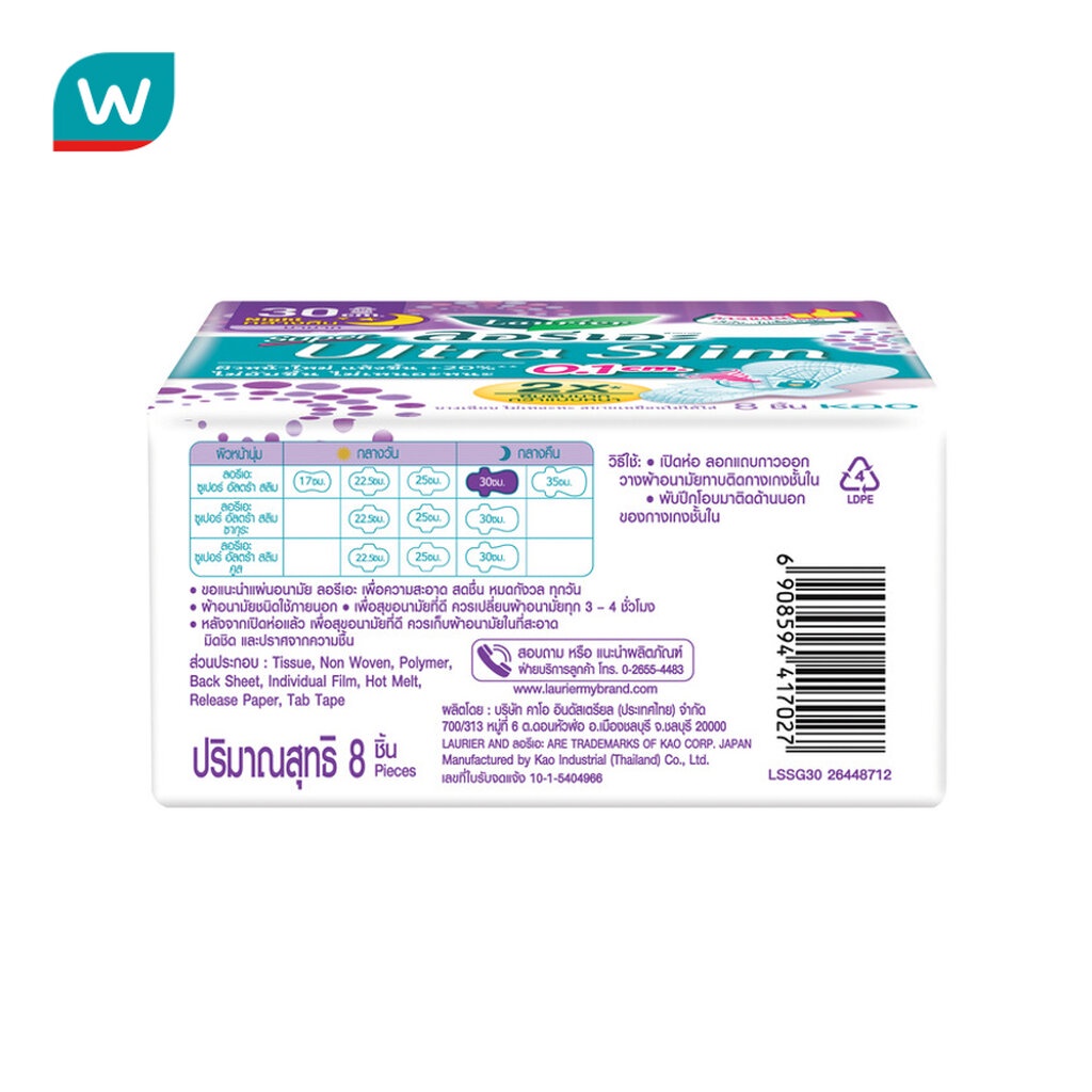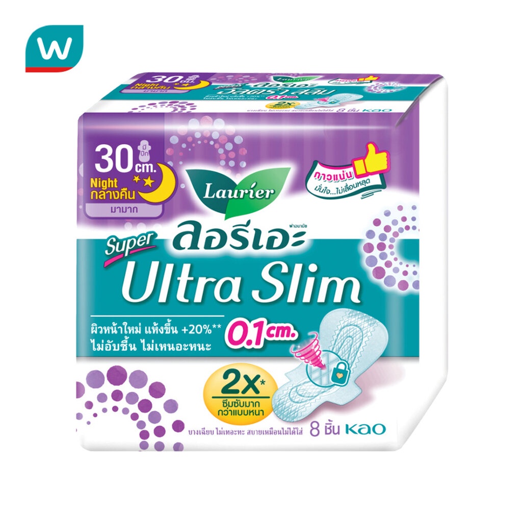 Laurier ลอริเอะ ผ้าอนามัย ซูเปอร์ อัลตร้า สลิม กลางคืน 30 ซม. มีปีก 8 ชิ้น