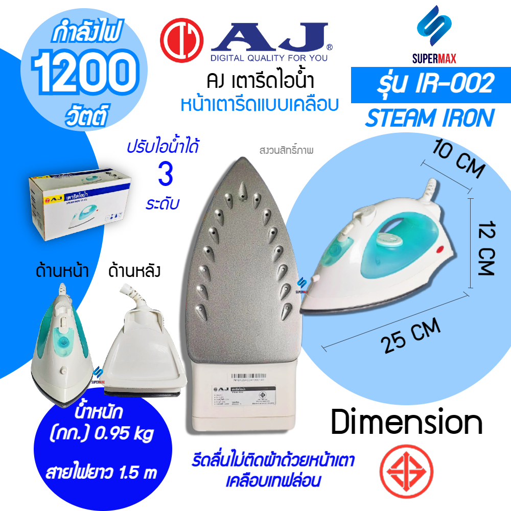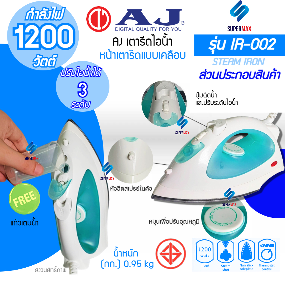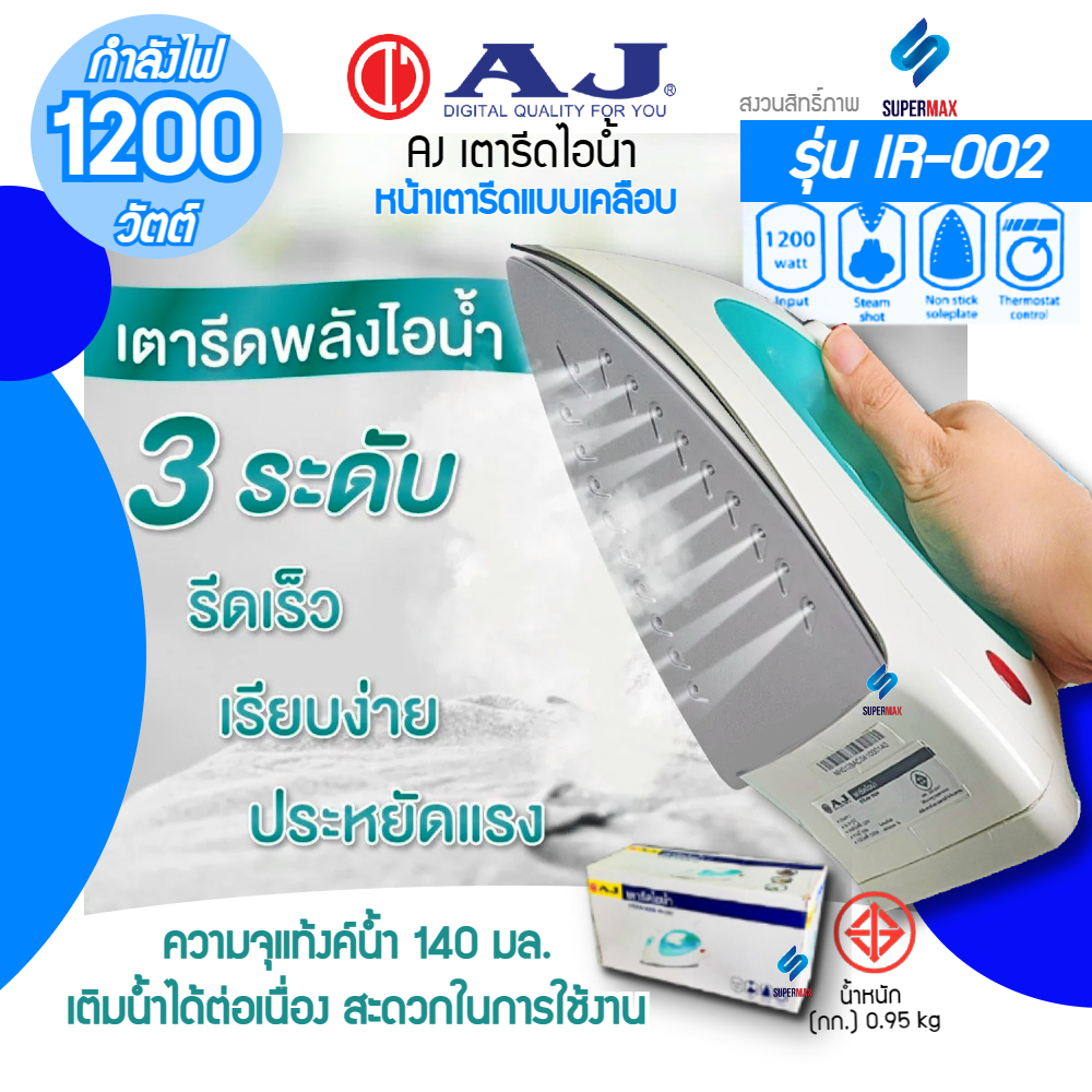 ราคาพิเศษ AJ เตารีดไอน้ำ กำลังไฟ 1200วัตต์ รุ่น AJ IR-002 หน้าเตารีดแบบเคลือบ รับประกันสินค้า 1ปี