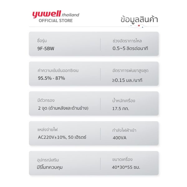 Yuwell เครื่องผลิตออกซิเจน ขนาด 5 ลิตร รุ่น 9F-5BW (รุ่นใหม่เสียงเงียบ)