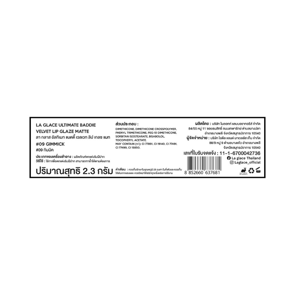 LA GLACE ลา กลาส อัลติเมท แบดดี้ เวลเวท ลิป กลาส แมท 2.3ก. 09 กิมมิค