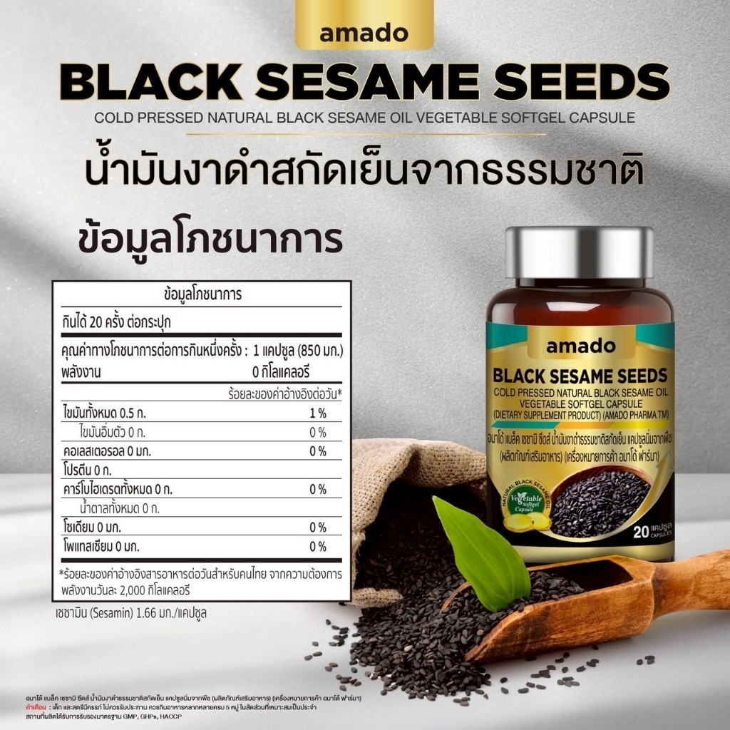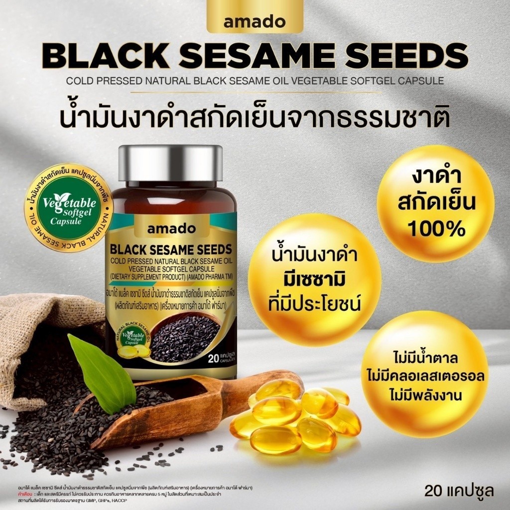 Amado Black Sesame Seeds อมาโด้ น้ำมันงาดำ [20 แคปซูล] [2 กระปุก] ดูแลสุขภาพ บำรุงกระดูกและข้อต่อ ดูแลหัวใจและสมอง