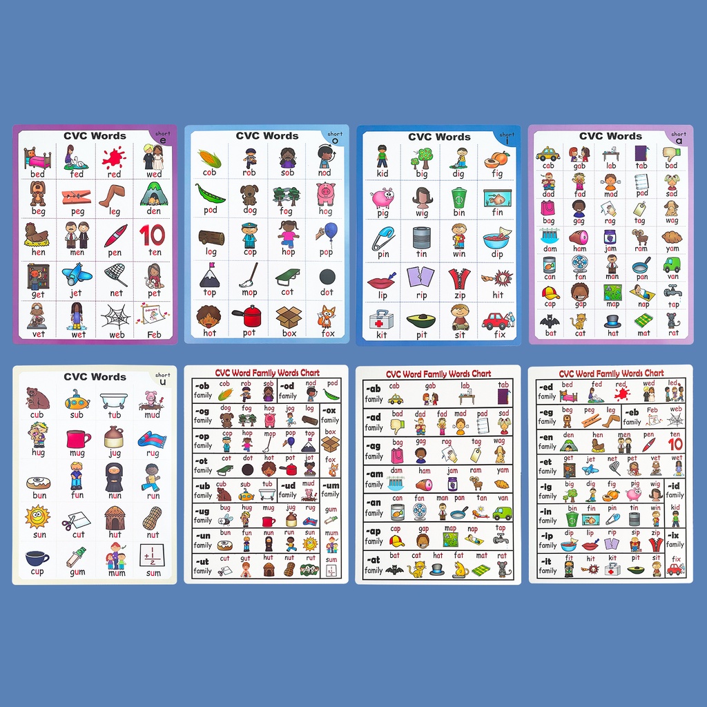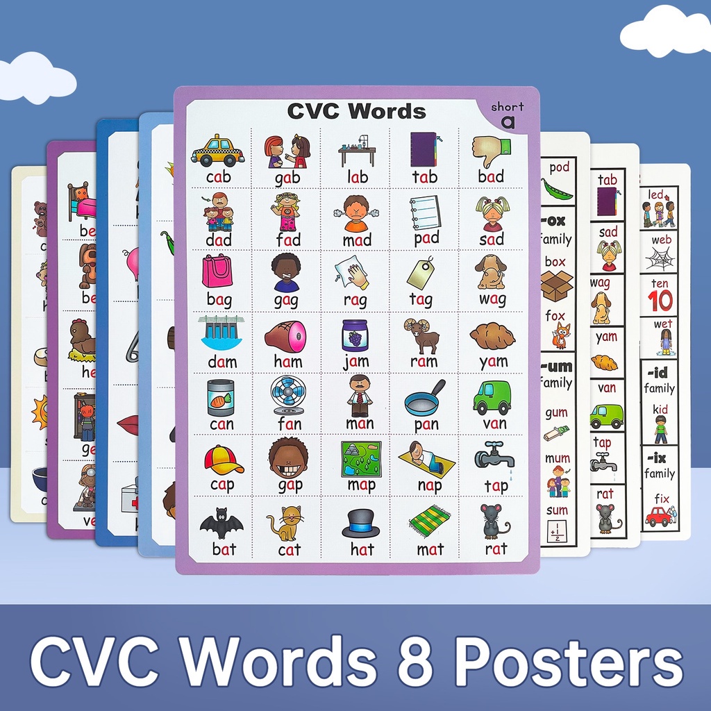 8Pcs CVC Phonics Words Poster Language Arts Skills Charts for Kids Classroom Word Family Wall Educational Posters Pre K Learning Smart Reading Pen