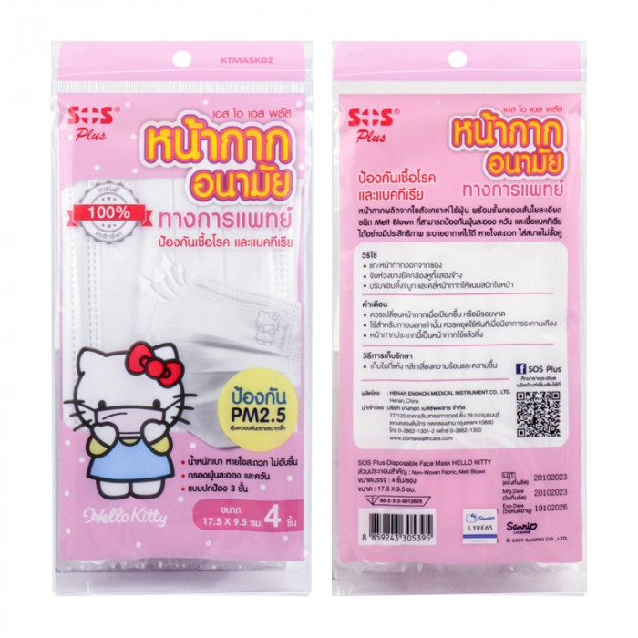 SOS Plus KITTY เด็ก/ผู้ใหญ่ เอสโอเอส พลัส หน้ากากอนามัยป้องกัน P.M 2.5 4 ชิ้น/ซอง