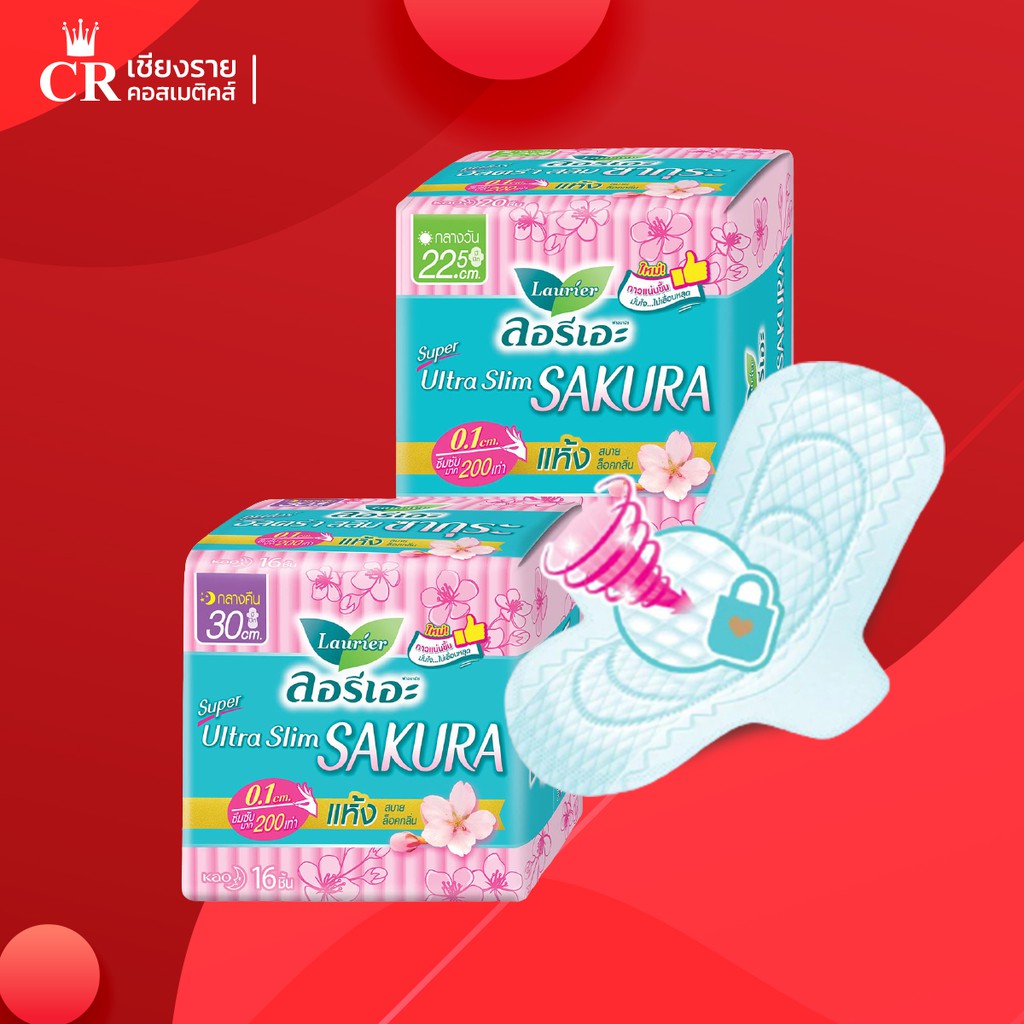 ลอรีเอะ ซูเปอร์ อัลตร้า สลิม ซากุระ ผ้าอนามัยแบบบางเฉียบ 0.1 cm. (กลางวัน/กลางคืน) ซึมซับมาก 200 เท่า