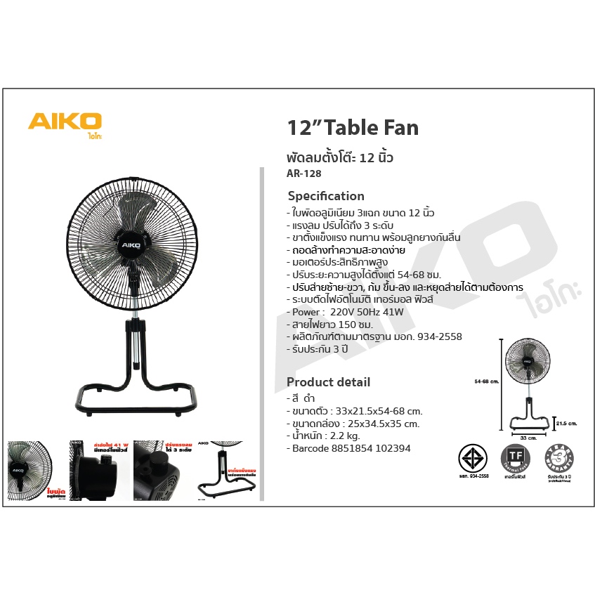 AIKO AR-128 พัดลมสไลด์ 12 นิ้ว พัดลมใบพัดอลูมิเนียม Mini Turbo Fan 12" พัดลมเล็ก compact size