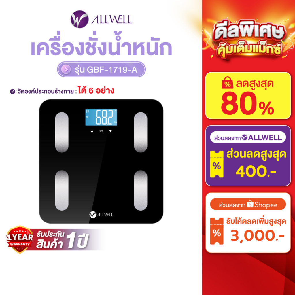ALLWELL เครื่องชั่งน้ำหนัก วัดไขมันและมวลกาย แบบดิจิตอล รุ่น GBF-1719-A BODY COMPOSITION SCALE