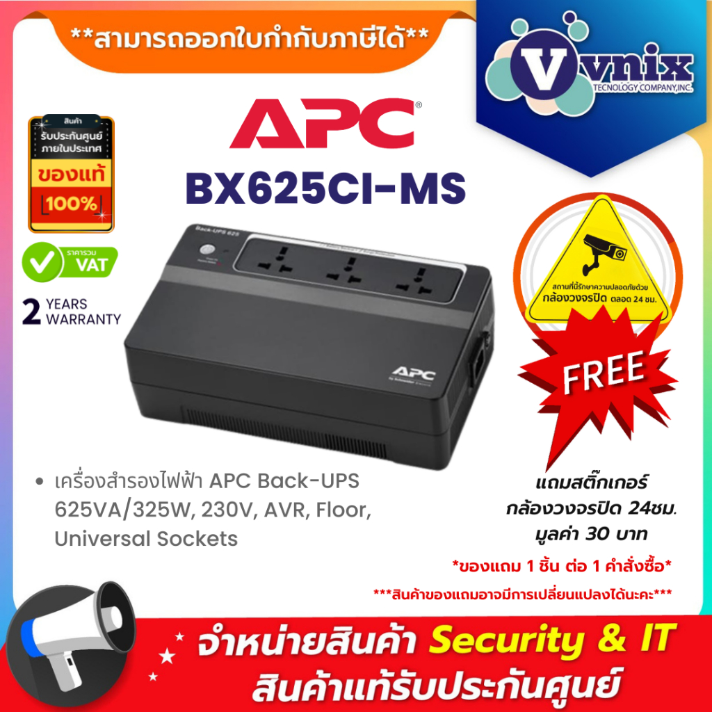 BX625CI-MS เครื่องสำรองไฟฟ้า APC Back-UPS 625VA/325W, 230V, AVR, Floor, Universal Sockets By Vnix Group