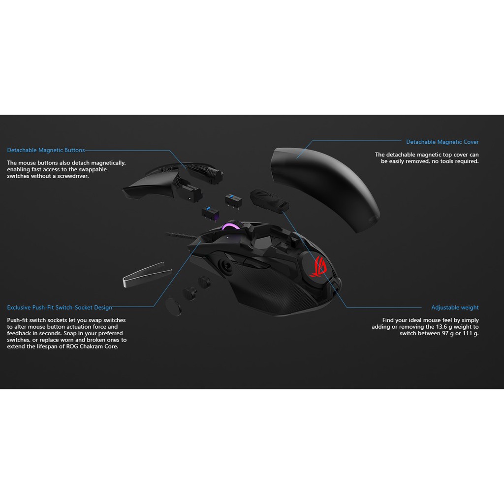 ASUS ROG Chakram Core gaming mouse featuring programmable joystick, advanced 16000 dpi sensor, push-fit switch sockets