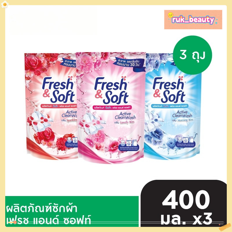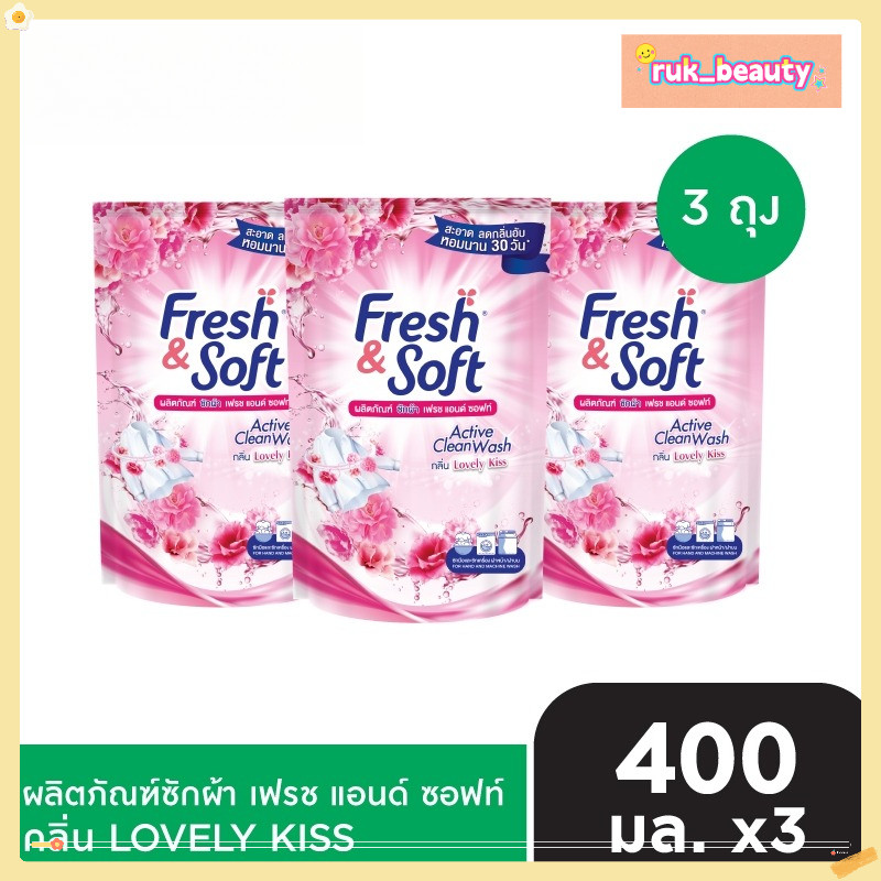 Fresh & Soft ผลิตภัณฑ์ซักผ้า เฟรช แอนด์ ซอฟท์ กลิ่น Lovely Kiss (สีชมพู) ชนิดเติม 400 ml แพ็ค 3 ถุง