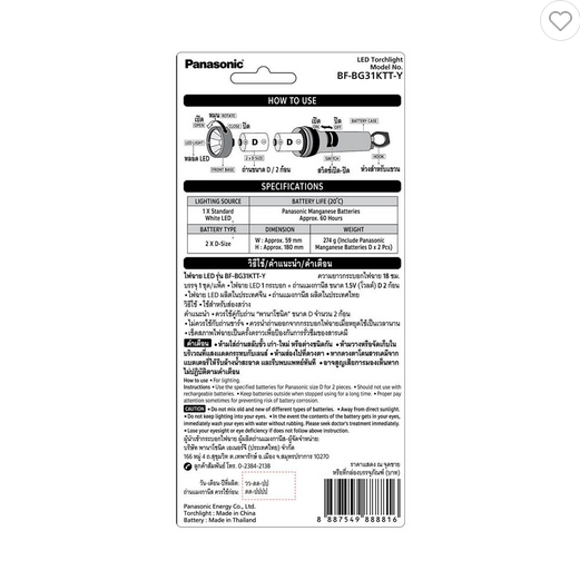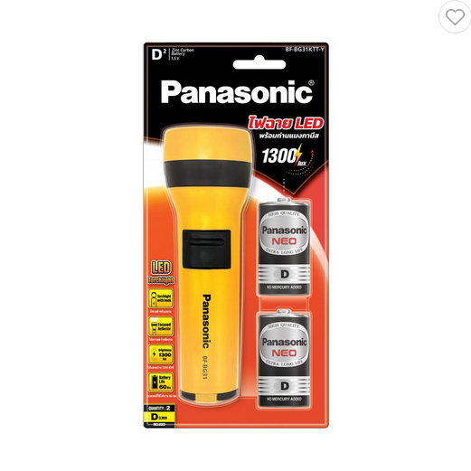 ไฟฉาย LED 300 ลูเมน 1.5 วัตต์ Cool White พร้อมถ่าน D 2 ก้อน PANASONIC BF-BG31KTT-Y