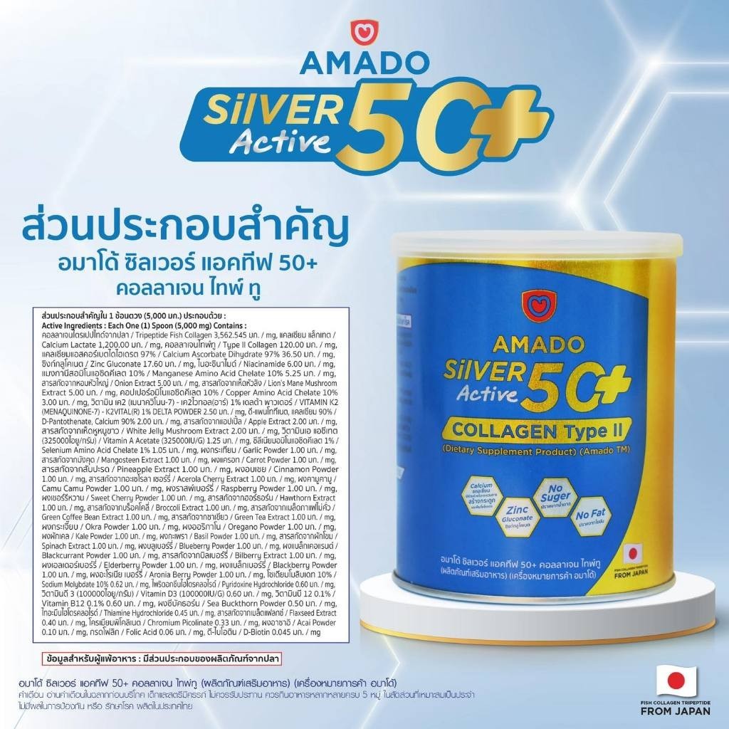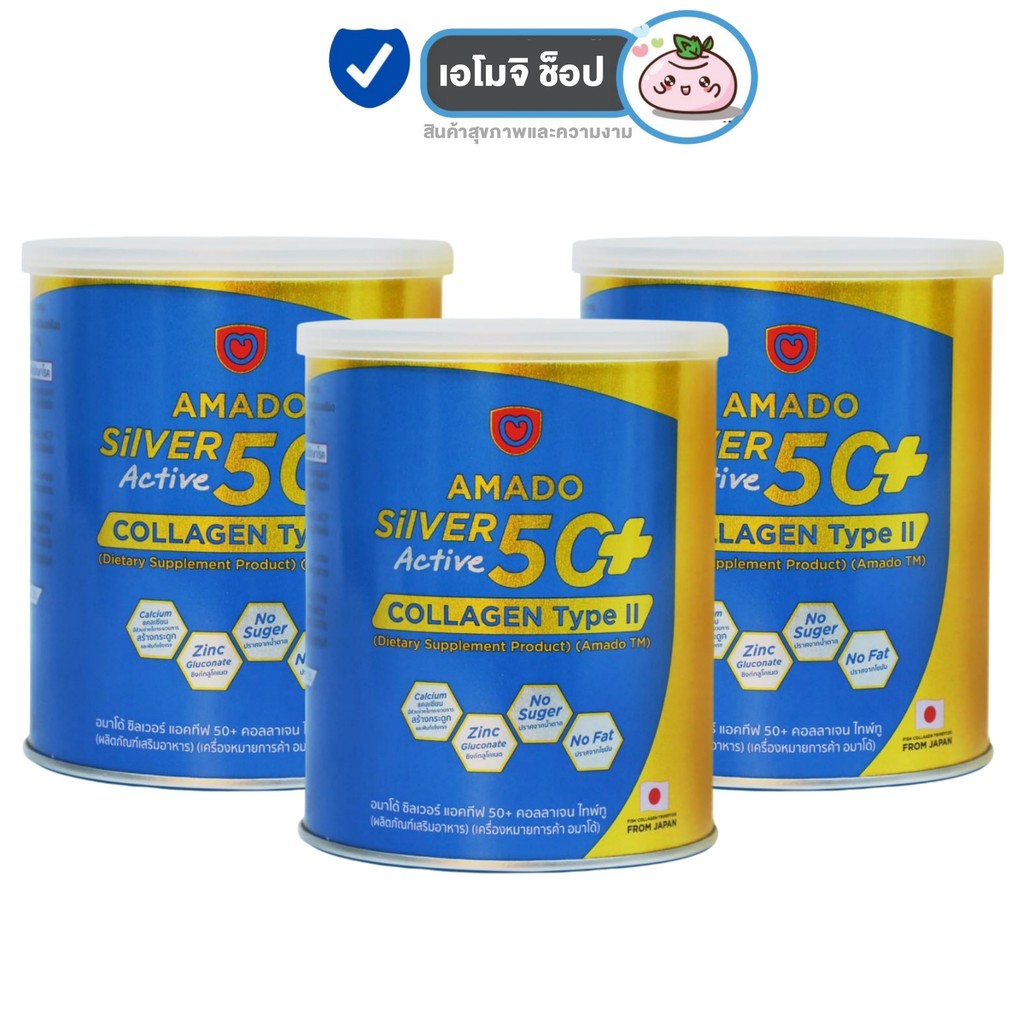 Amado Silver Active 50+ Collagen Type II อมาโด้ ซิลเวอร์ แอคทีฟ 50+ คอลลาเจน ไทพ์ ทู [100 g.] [3 กระปุก] แคลเซียม กระดูก