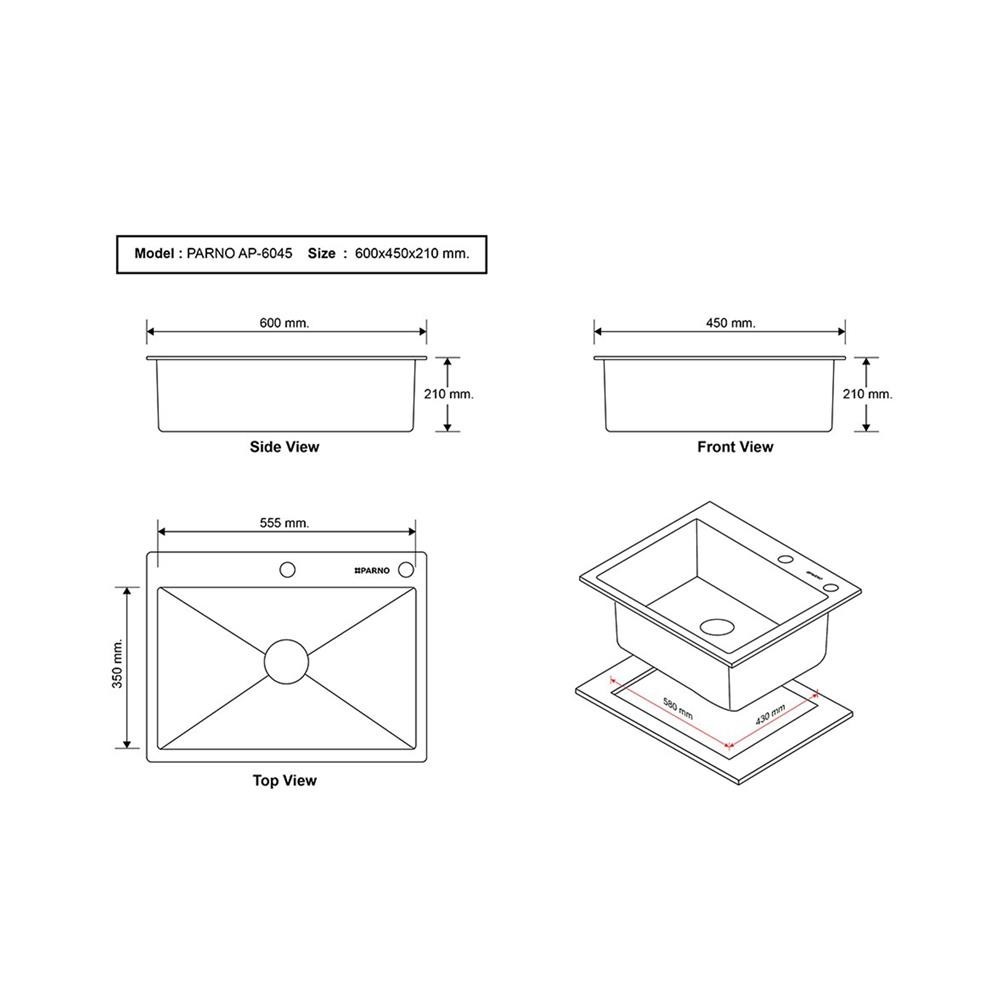 [จัดส่งพร้อมติดตั้ง] PARNO ซิงค์ฝังสแควร์ 1 หลุม AP-6045 สีเงิน จัดส่งโดย HomePro