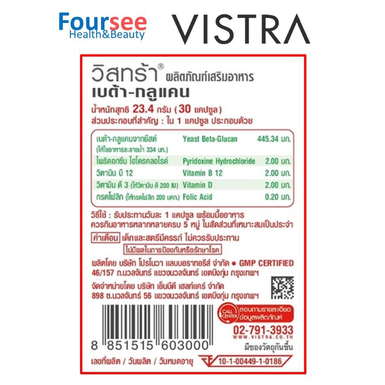 VISTRA Beta Glucan 30 แคปซูล วิสทร้า ยีสต์ เบต้ากลูแคน