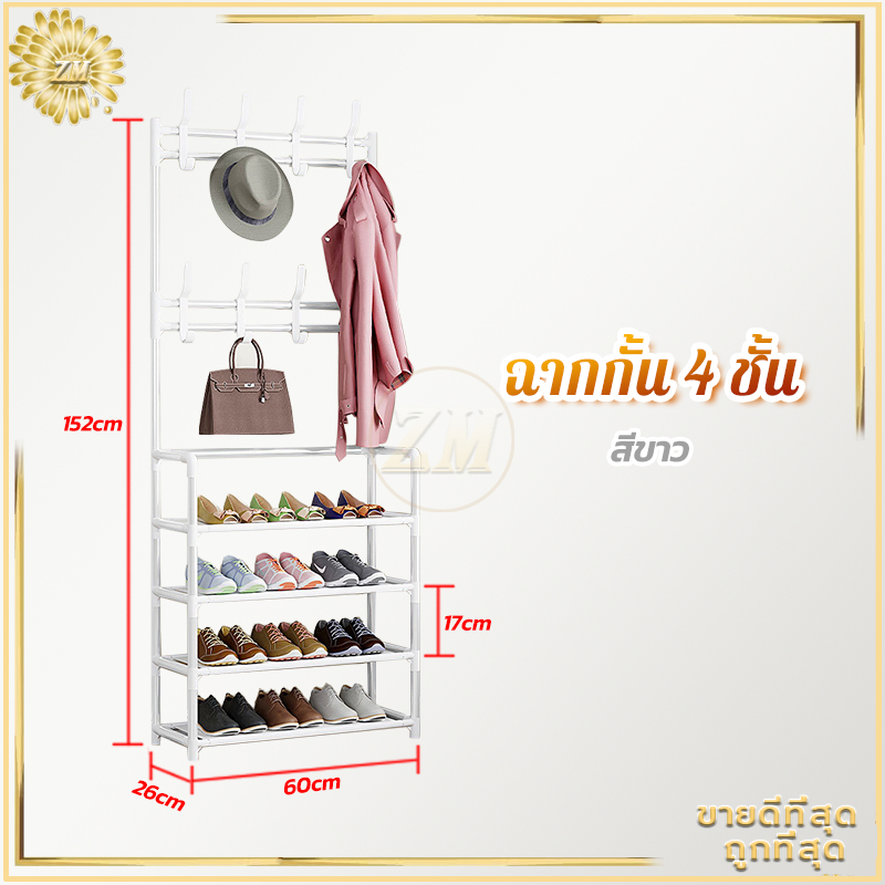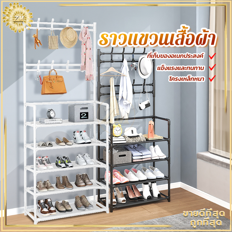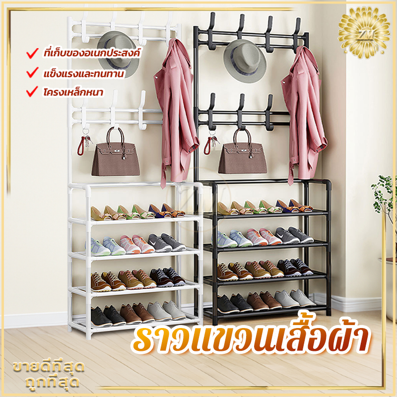 ราวแขวนเสื้อผ้า ชันวางรองเท้า ชั้นแขวนผ้า ราวแขวนกระเป๋า ชั้นวางของ มาพร้อมตะขอแขวนเสื้อและแขวนหมวก โครงเหล็กเเข็งเเรง
