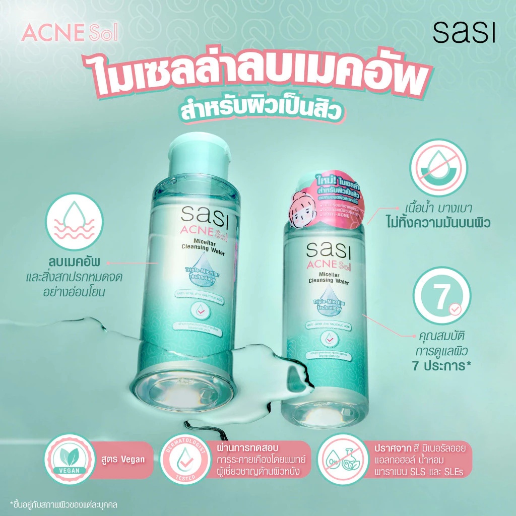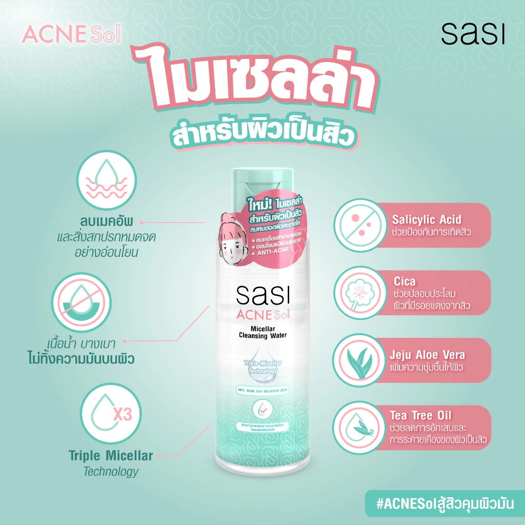 (1 ขวด) sasi ศศิ แอคเน่ โซล ไมเซลล่า คลีนซิ่ง วอเตอร์ (ปริมาณ 100 ml.)