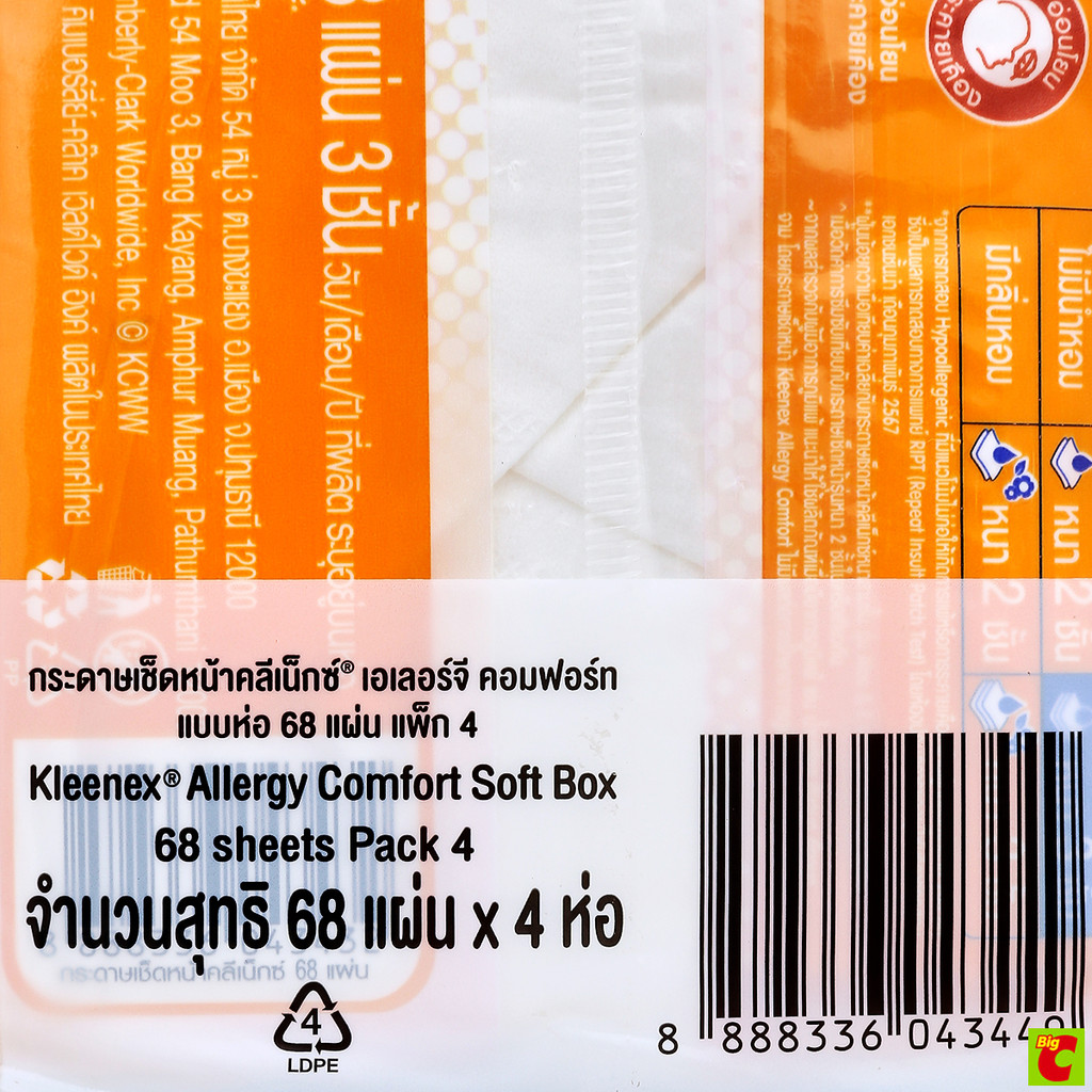 คลีเน็กซ์ กระดาษเช็ดหน้า เอเลอร์จี คอมฟอร์ท 68 แผ่น x 4 ชิ้น