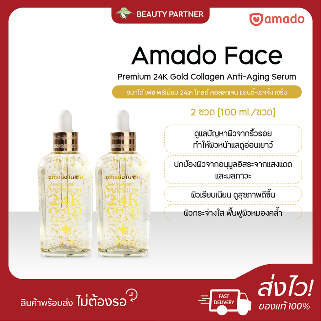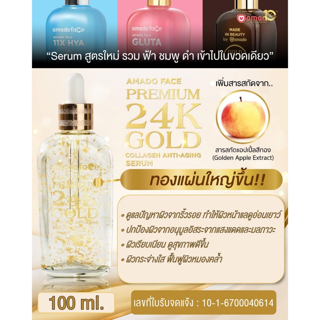 Amado Premium 24K Gold Collagen Anti-Aging Serum อมาโด้ พรีเมี่ยม 24K โกลด์ เซรั่ม [100 ml.] [2 ขวด] ลดริ้วรอย จุดด่างดำ