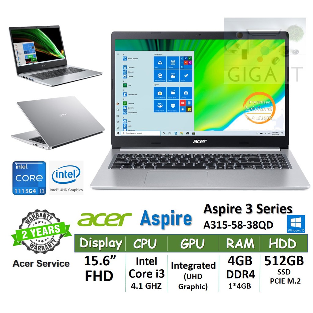Acer Notebook Aspire 3_A315-58-38QD (15.6" FHD, i3 1115G4, 4G, 512GB PCle M.2, Win10) Pure Silver ประกันเอเซอร์ 2 ปี