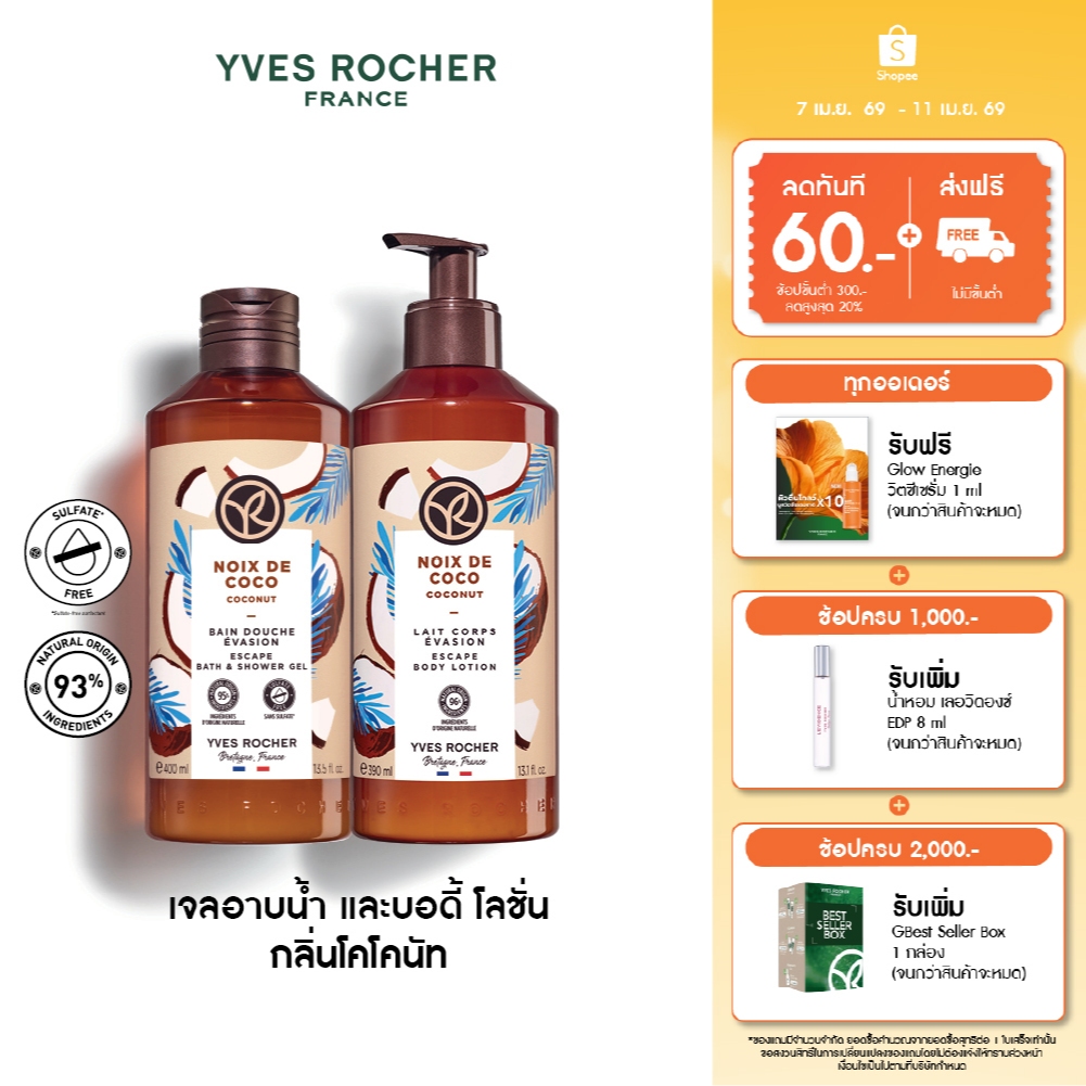 [แพ็คคู่] อีฟ โรเช Yves Rocher Coconut Escape Body Lotion 390 มล. & Shower Gel 400 มล. โลชั่นบำรุงผิว เจลอาบน้ำ